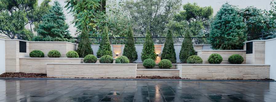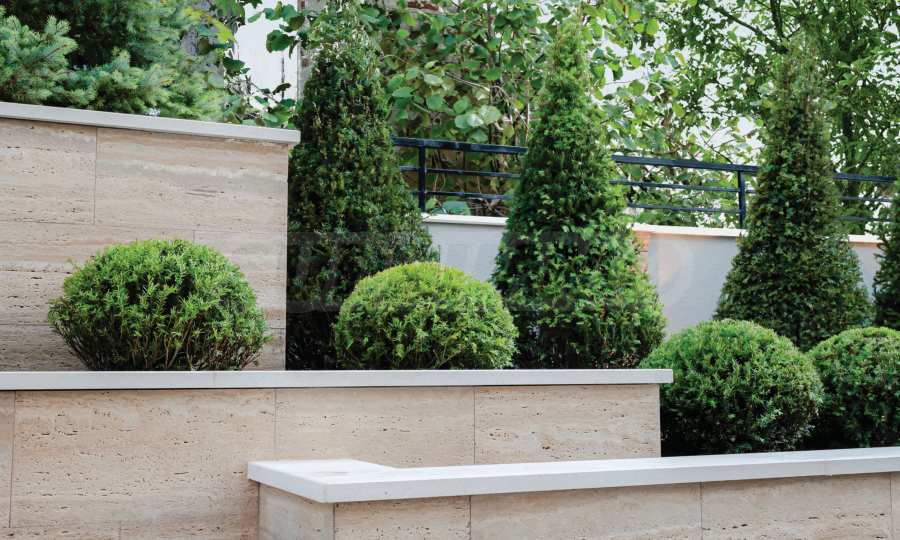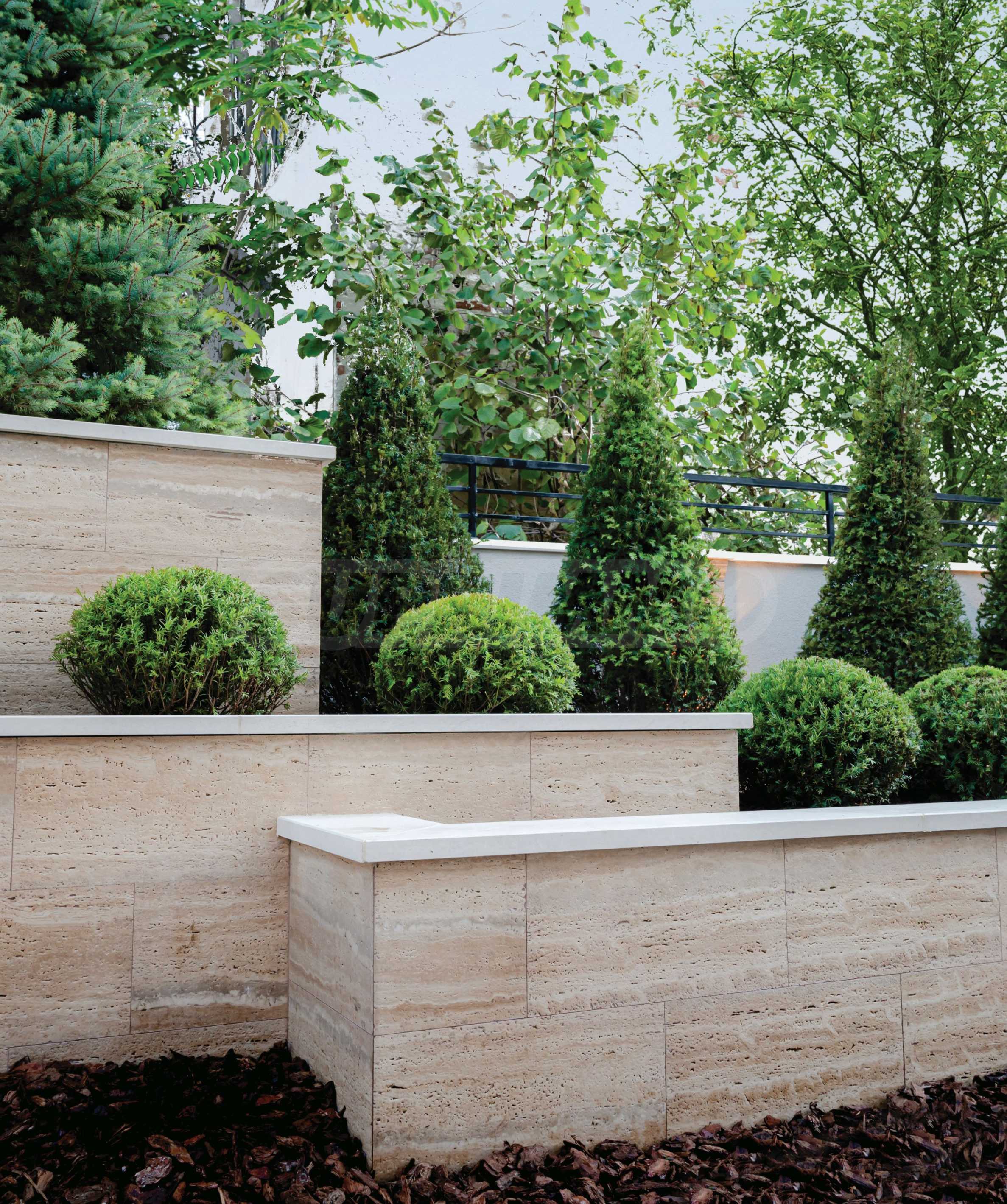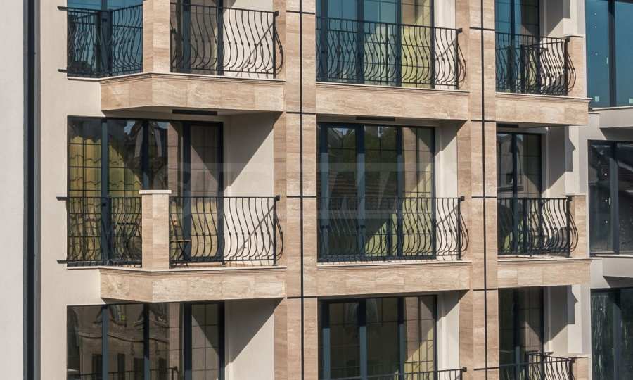 - trawertynowe elewacje z kamienia naturalnego i balustrady z kutego żelaza;