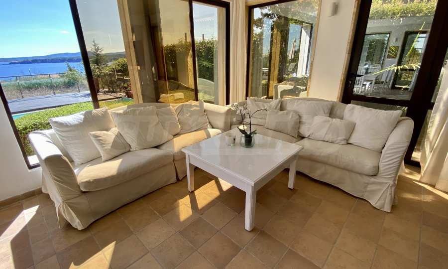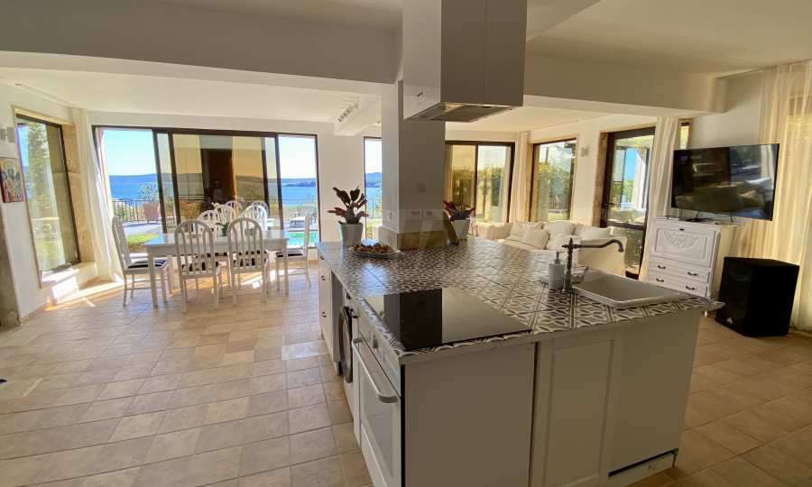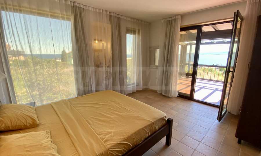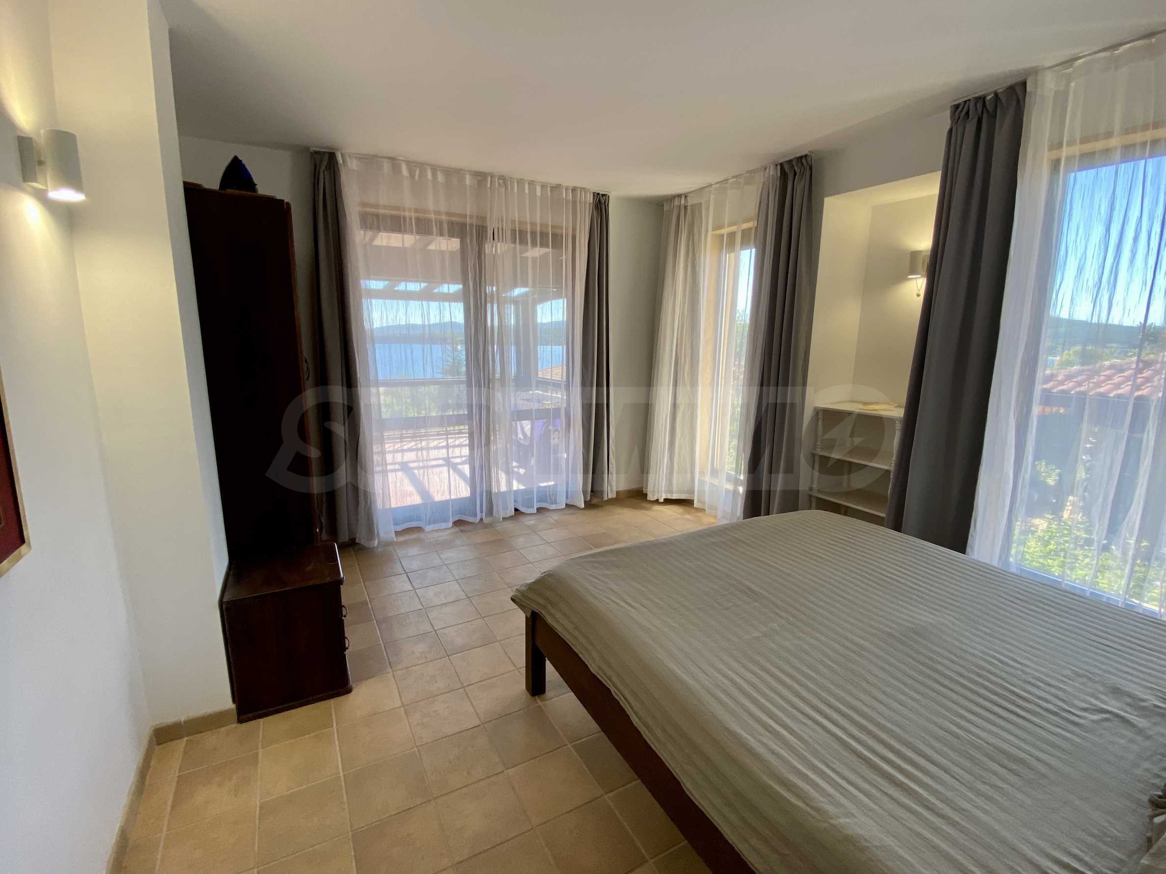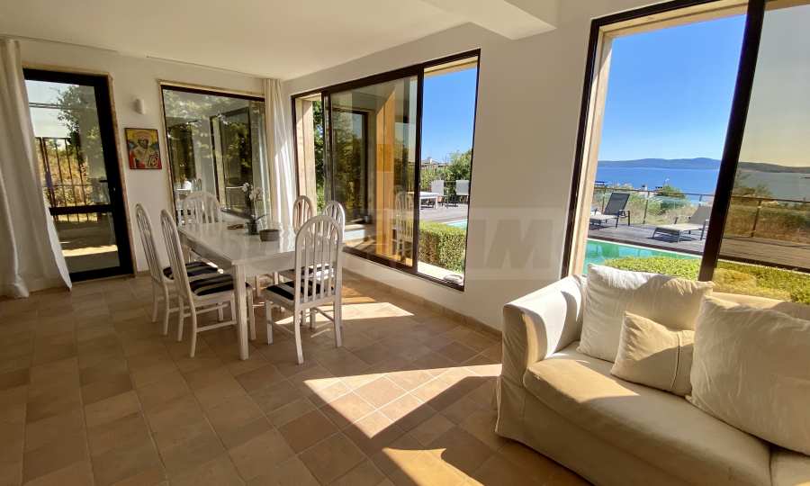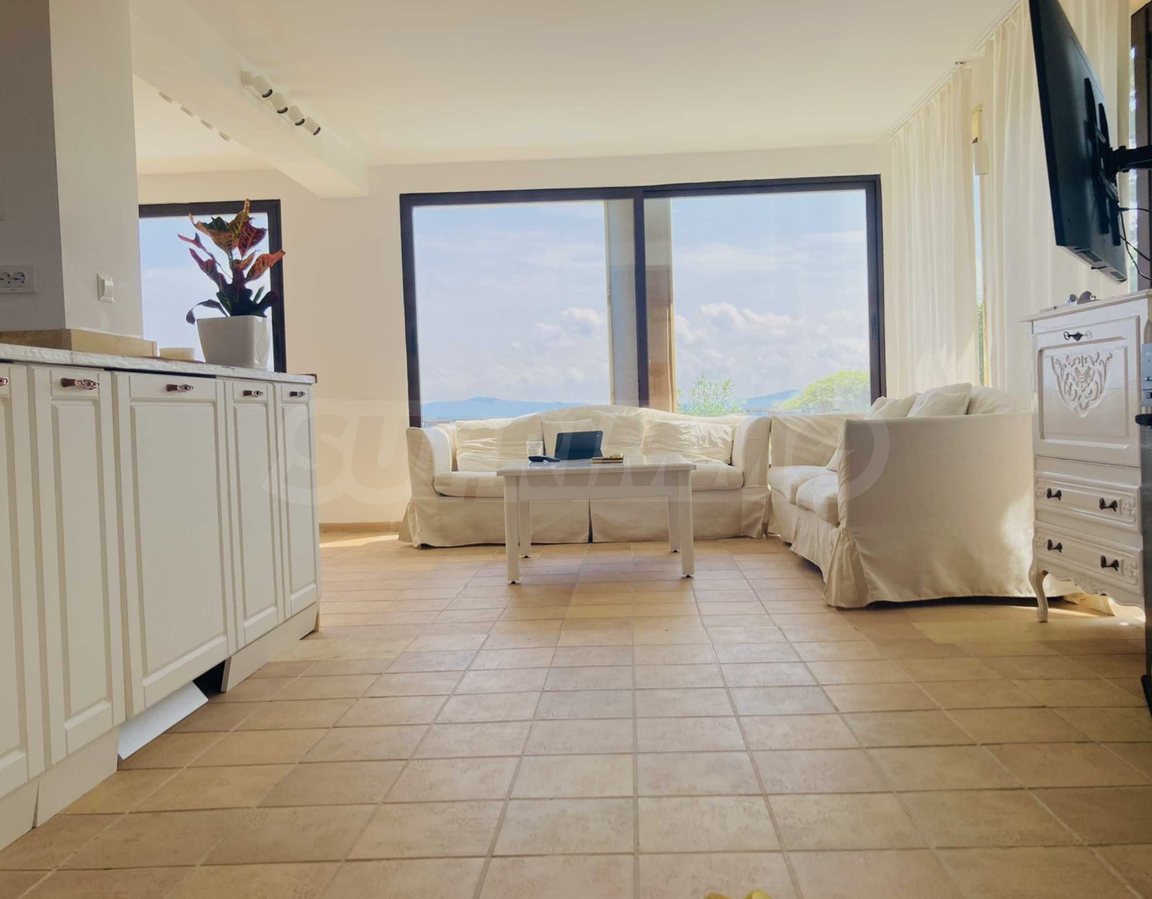 Dom jest rozmieszczony na dwóch poziomach, składa się z panoramicznego salonu z kuchnią, czterech przytulnych sypialni, czterech łazienek, przestronnych tarasów z frontalnym widokiem na morze i basen. Tylny taras jest zadaszony, istnieje możliwość przerobienia na drugi salon, 2 pokoje lub inne, powierzchnia tarasu to 40 mkw.