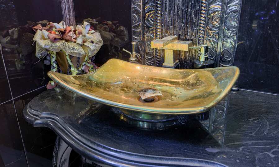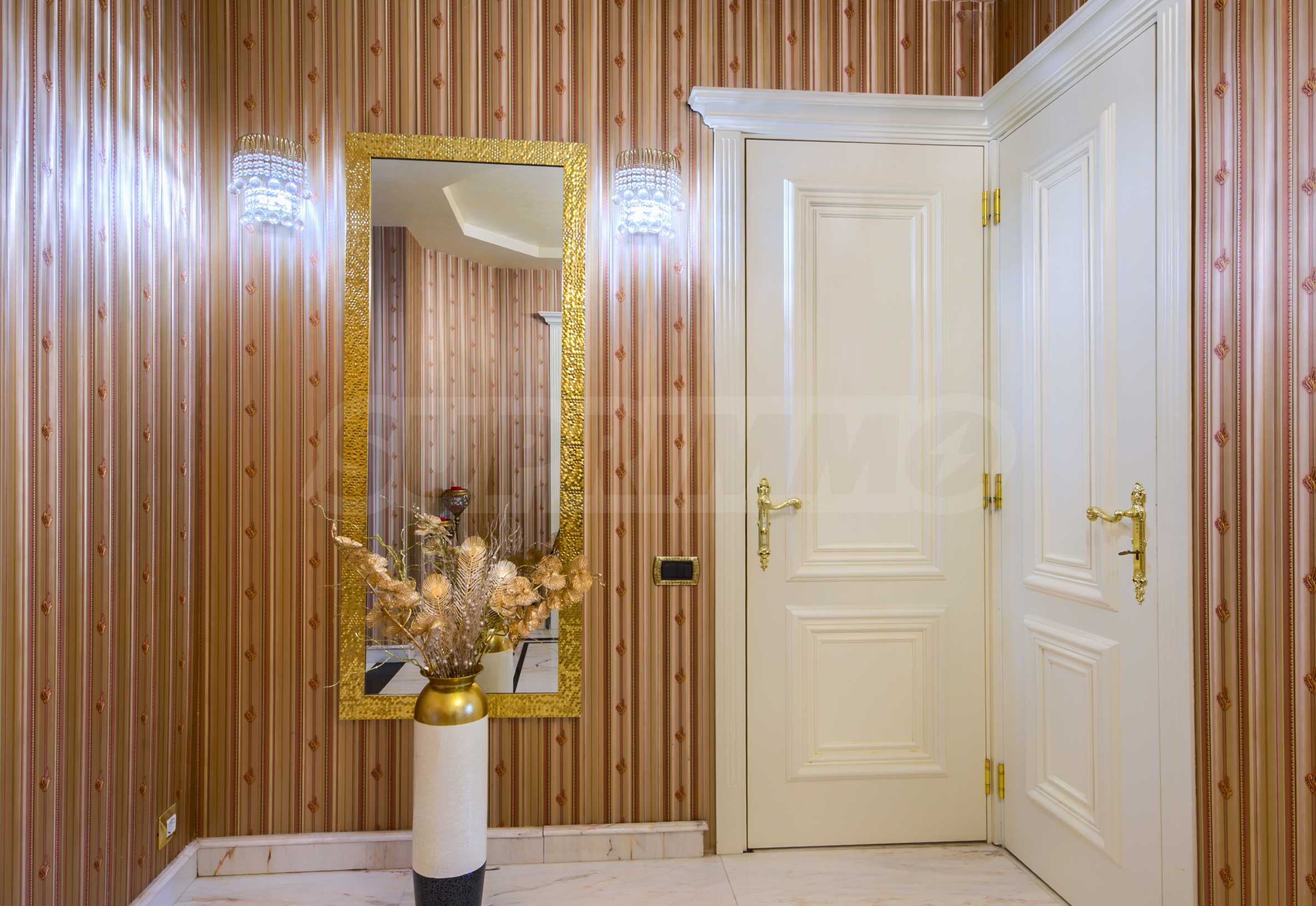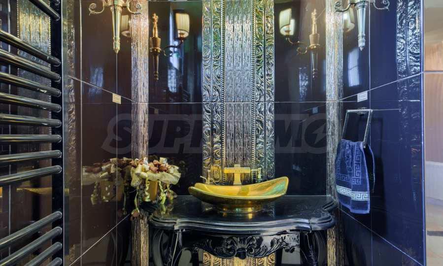 • Pierwsze piętro (230 m²): przestronny hol wejściowy, słoneczny salon z ogrodem zimowym i wspaniałym marmurowym kominkiem – repliką kominka z zamku Balmoral. Na tym samym piętrze znajduje się jadalnia, kącik kawowy, kuchnia w arystokratycznym stylu retro z oświetleniem Bohemia i Swarovski, a także łazienka gościnna w wykwintnym czarno-złotym stylu Versace. Z salonu prowadzi bezpośrednie wyjście na dziedziniec.