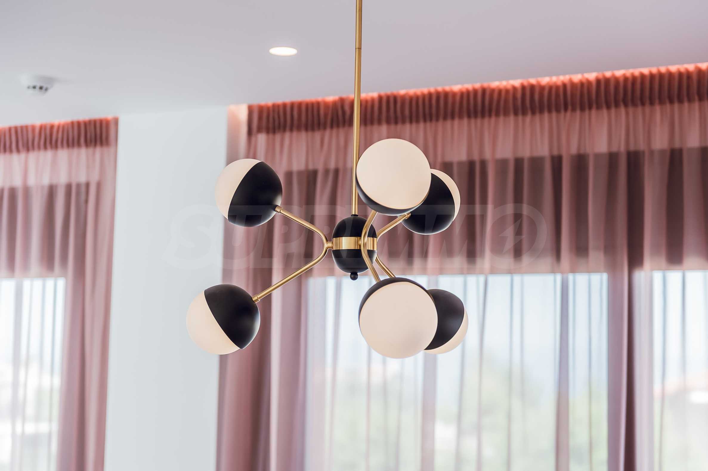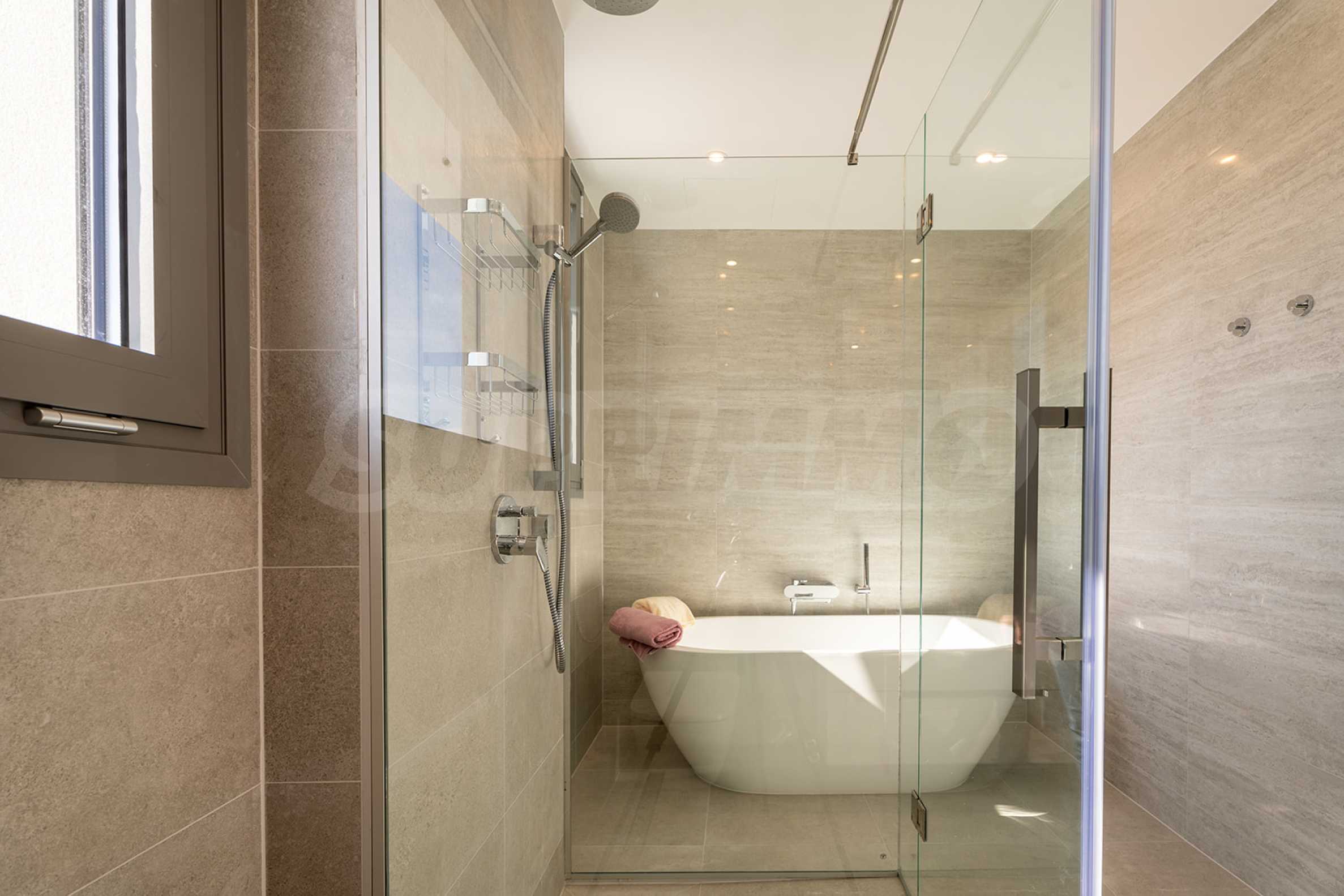 Willa ma nowoczesną minimalistyczną estetykę i jest zbudowana w odcieniach stylu śródziemnomorskiego z nowoczesnymi rozwiązaniami technicznymi. Część budynków ozdobiona jest naturalnym kamieniem, trawertynem. Kompozycja z anodowanego metalu to rozwiązanie architektoniczne, które dobrze podkreśla nowoczesny styl. Dzięki tym rozwiązaniom domek będzie wyglądał imponująco nawet po kilkudziesięciu latach!