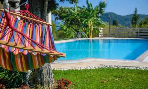 Duży basen, który latem jest centrum zainteresowania, znajduje się na końcu ogrodu i otoczony jest trawnikami. Wokół niego jest dużo miejsca na relaks i delektowanie się jedzeniem lub piciem pod gwiazdami, w jednej z części wypoczynkowych lub w jadalni na świeżym powietrzu. Tuż obok znajduje się kamienny grill, na którym można delektować się kolacjami w gronie rodziny i przyjaciół.