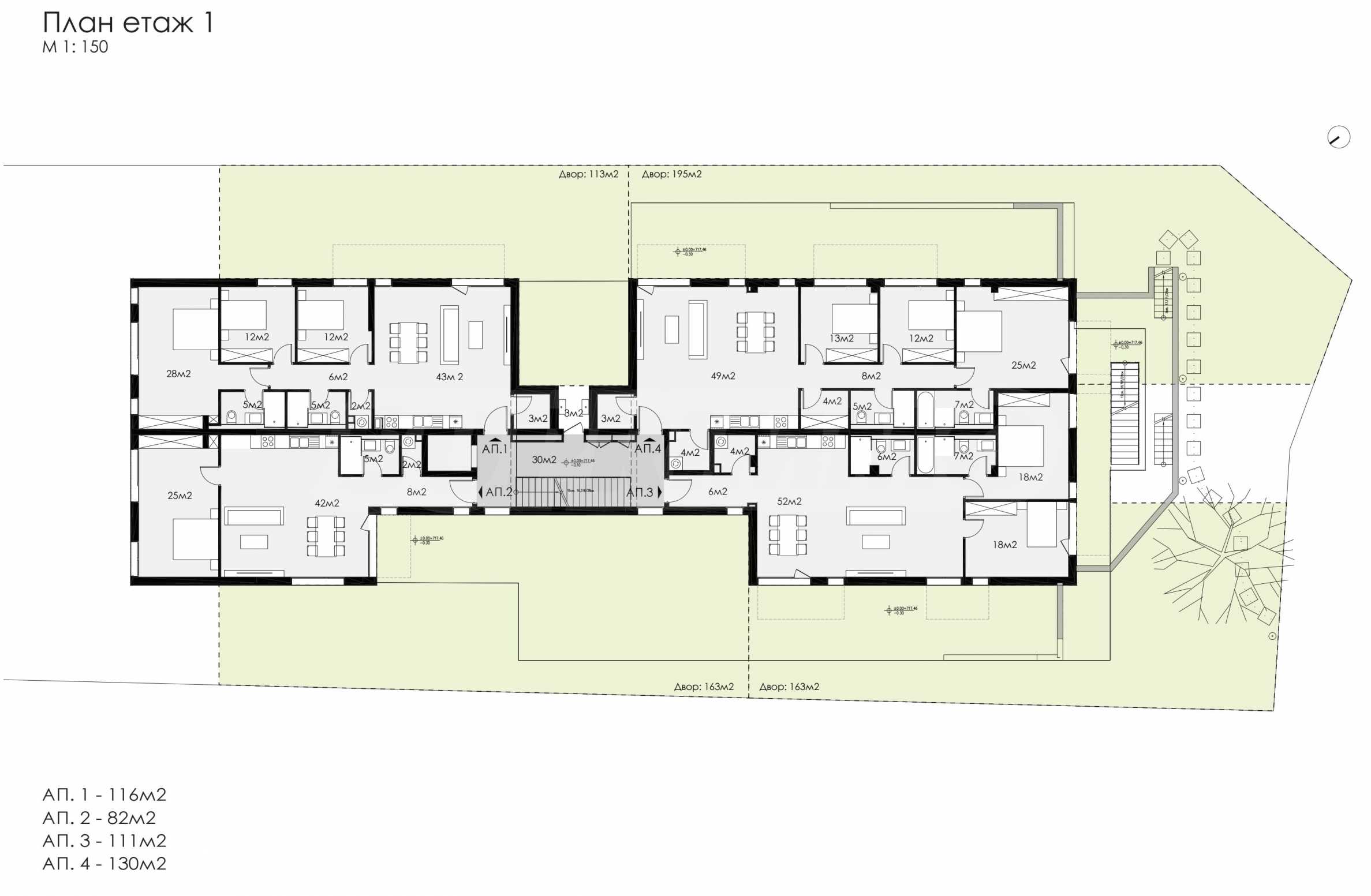 Apartament znajduje się na parterze i składa się z salonu z kuchnią, sypialni, łazienki z toaletą, pomieszczenia gospodarczego oraz prywatnego ogródka o powierzchni 163 m2.