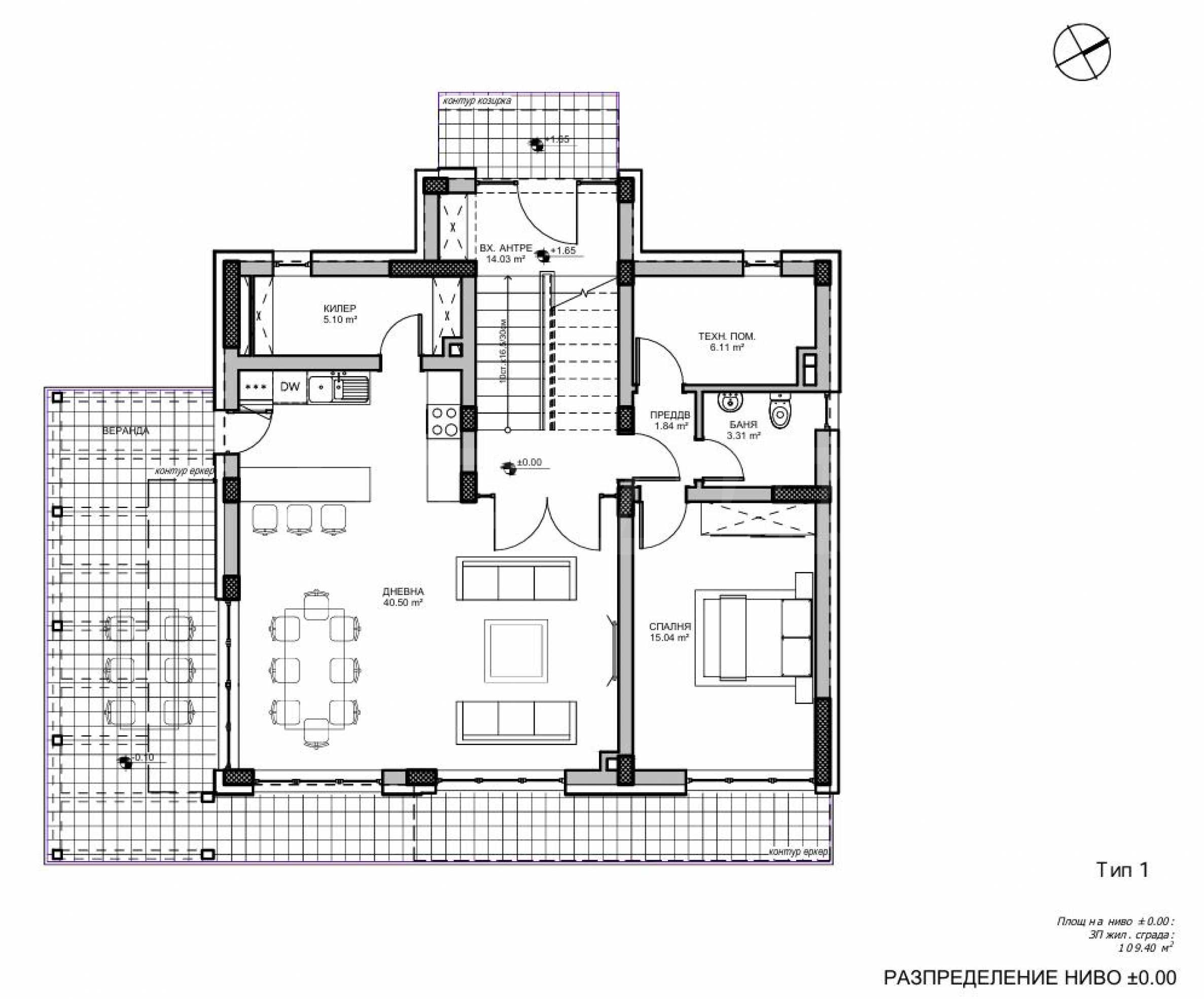 Piętro 1 - 109,40 m2: salon, sypialnia, łazienka, hol wejściowy, pomieszczenie techniczne, pomieszczenie gospodarcze
