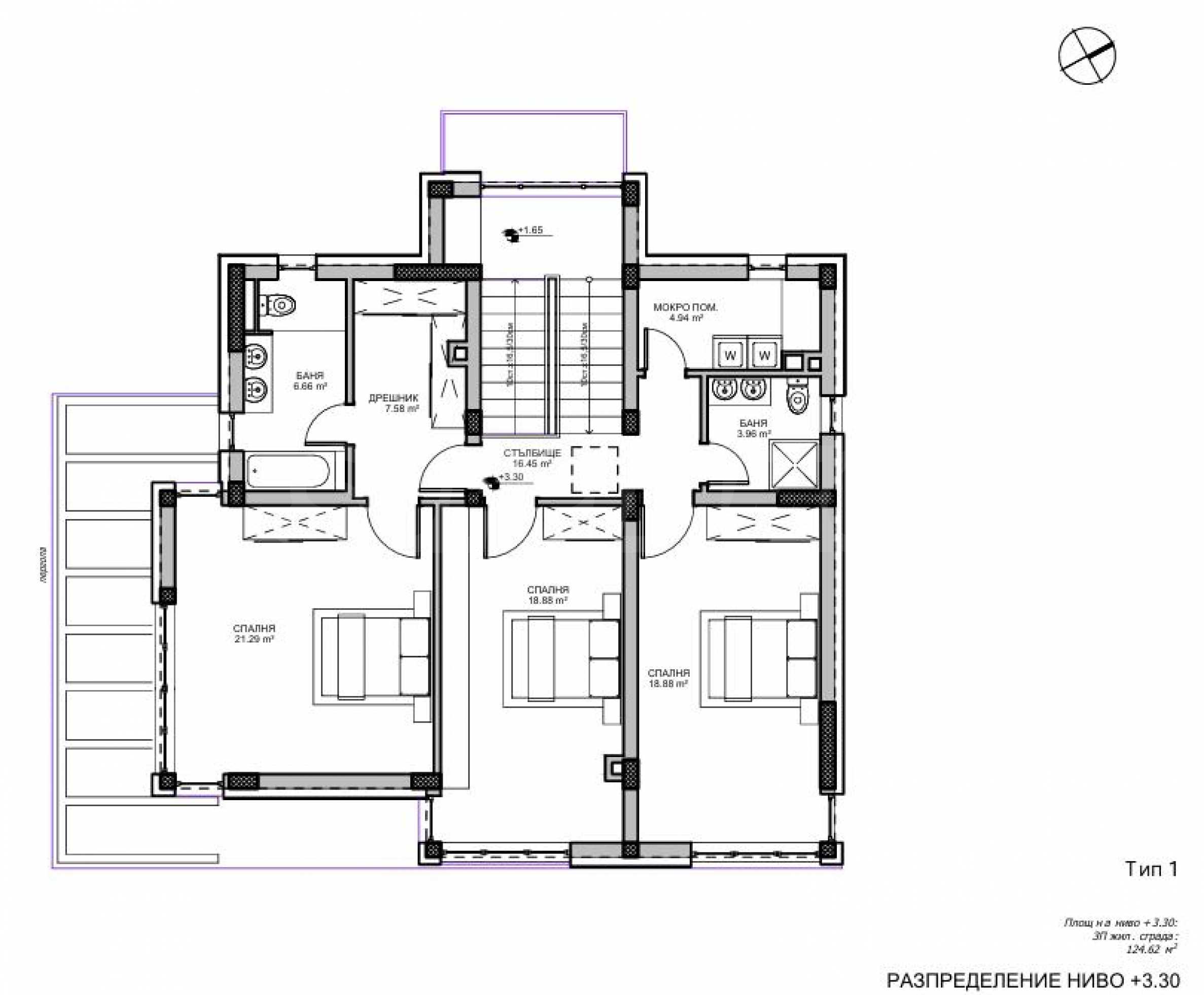 Piętro 2 - 124,62 m2: trzy sypialnie, dwie łazienki, garderoba, pomieszczenie gospodarcze