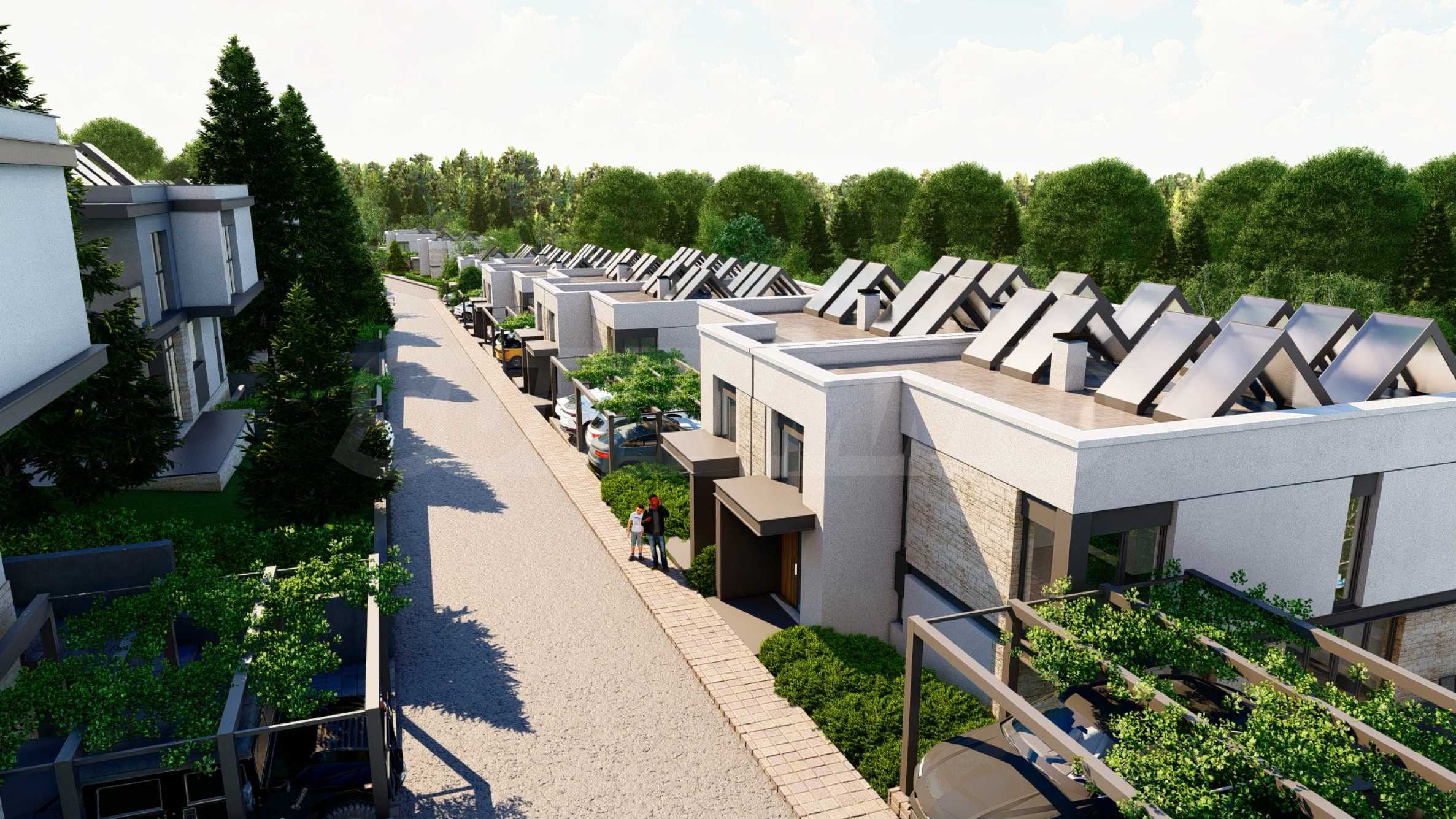 Domy w kompleksie są zaprojektowane na dwóch piętrach w nowoczesnym, czystym stylu i posiadają własne podwórko o powierzchni do 600 m2, które jest idealne do wypoczynku lub spotkań na świeżym powietrzu. Konstrukcja wykonana jest z wysokiej klasy materiałów, z niezwykłą precyzją i dbałością o szczegóły. Wyjątkowość terenu i lokalizacja poszczególnych domów zapewniają panoramiczny i kojący widok na każdą nieruchomość.