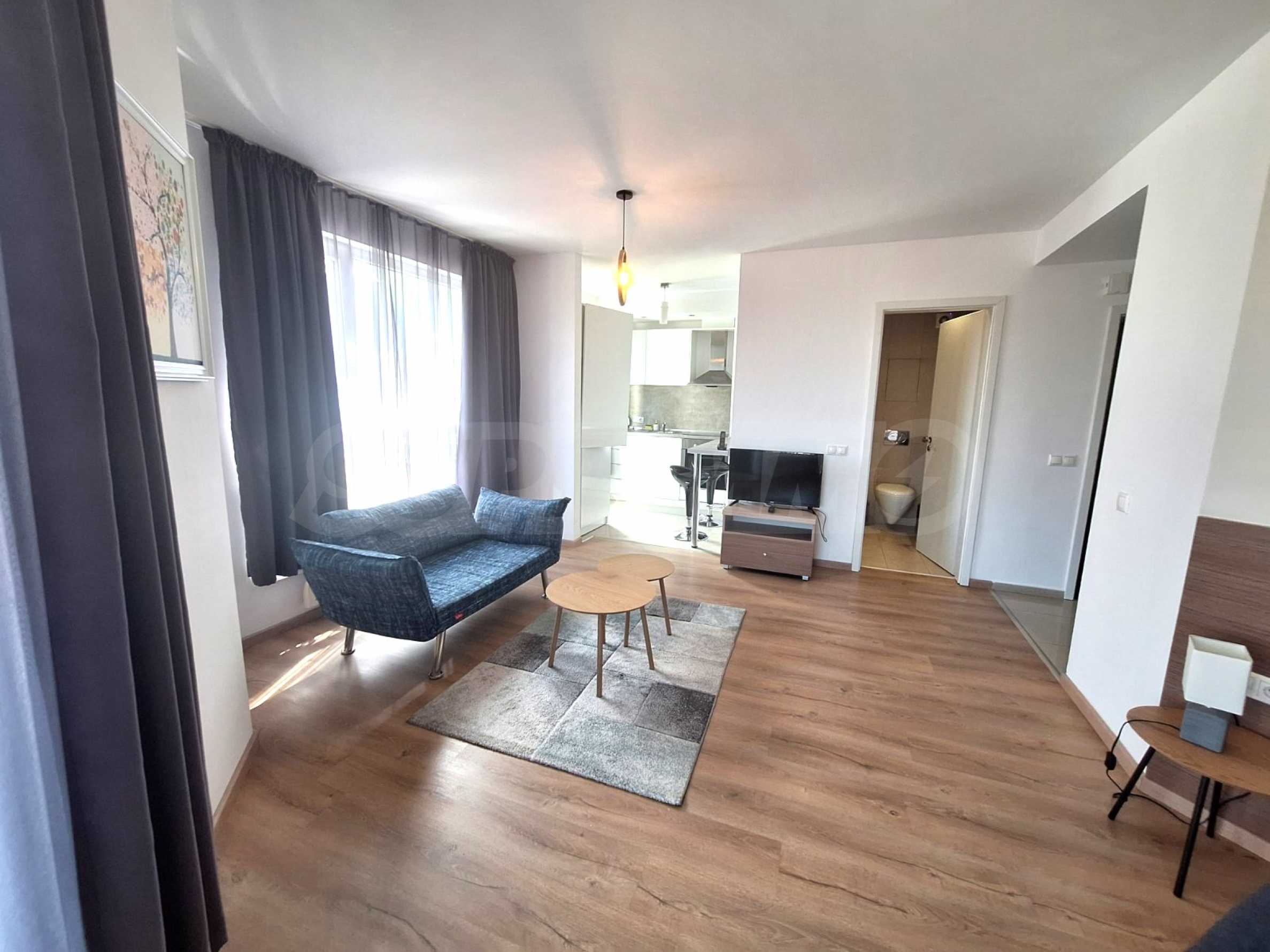 Układ funkcjonalny: korytarz, przestronny salon z dużą sypialnią, sofą, stolikiem kawowym, telewizorem, kuchnia z barkiem śniadaniowym, łazienka z kabiną prysznicową i toaletą;