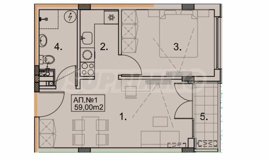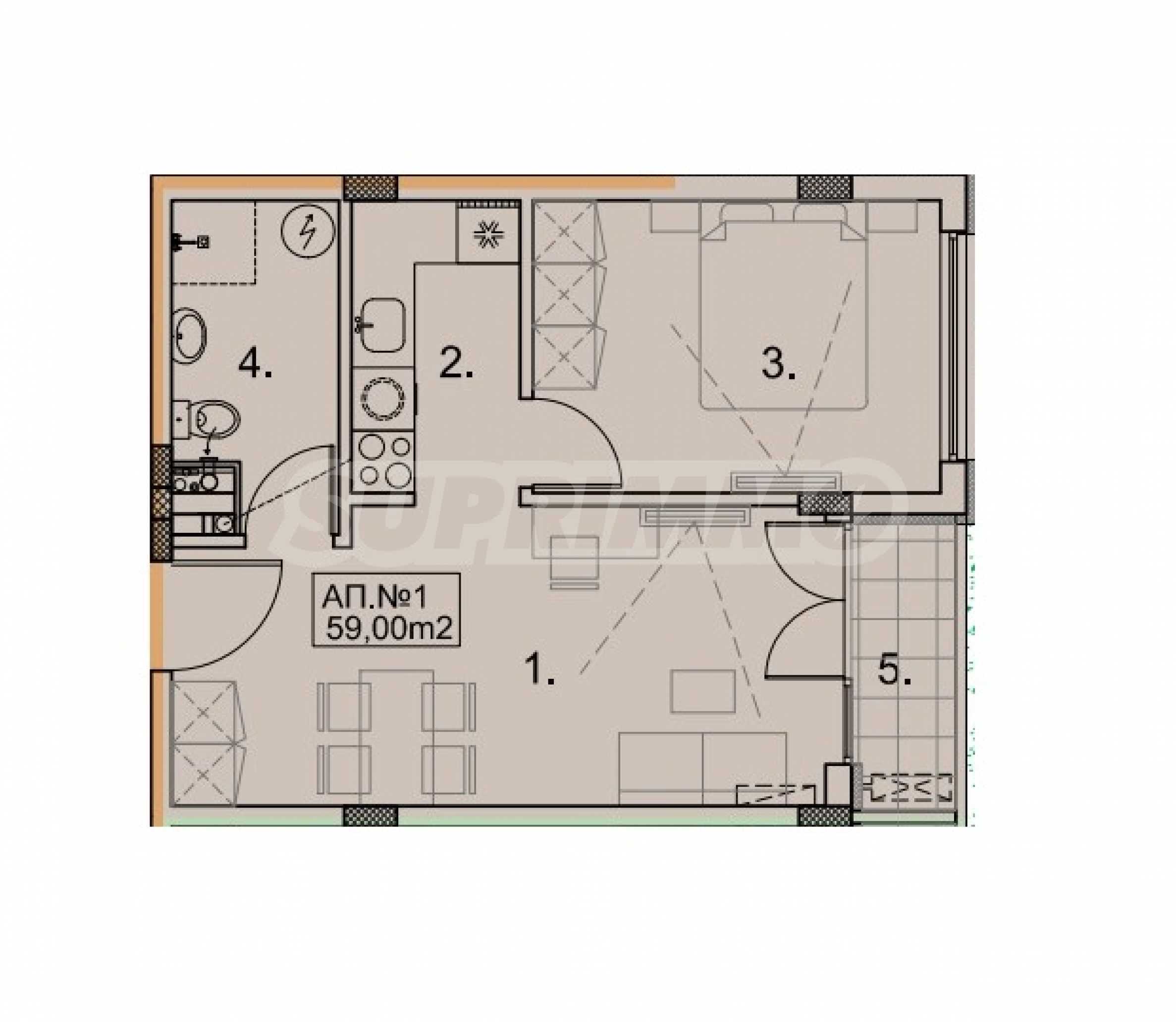 Nieruchomość zlokalizowana jest na parterze i oferuje powierzchnię całkowitą 58,71 mkw. Składa się z salonu połączonego z aneksem kuchennym i wyjściem na taras z widokiem na basen kompleksu, sypialni oraz łazienki z toaletą.