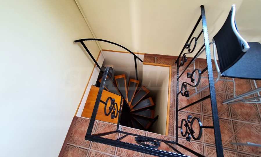 - I piętro: korytarz, trzy sypialnie, łazienka z wanną, prysznicem i WC, garderoba, weranda, wewnętrzne kręcone schody i szerokie zewnętrzne schody na drugi poziom;