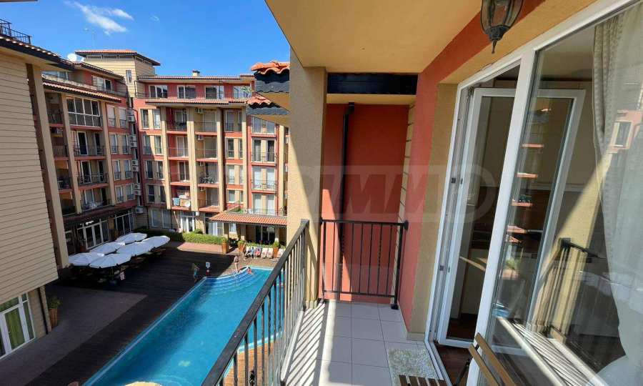 Nieruchomość znajduje się na 3 piętrze, ma powierzchnię całkowitą 34 m2 i posiada taras z widokiem na basen. Mieszkanie jest w pełni umeblowane i gotowe do zamieszkania.