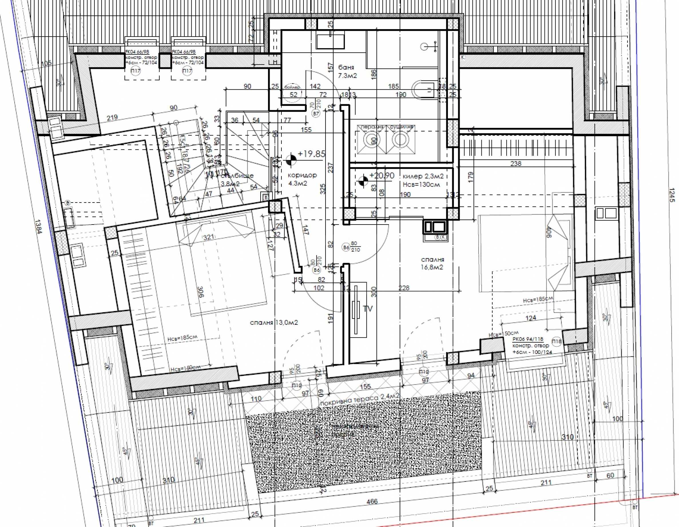2 poziom: łazienka z toaletą, dwie sypialnie i taras;