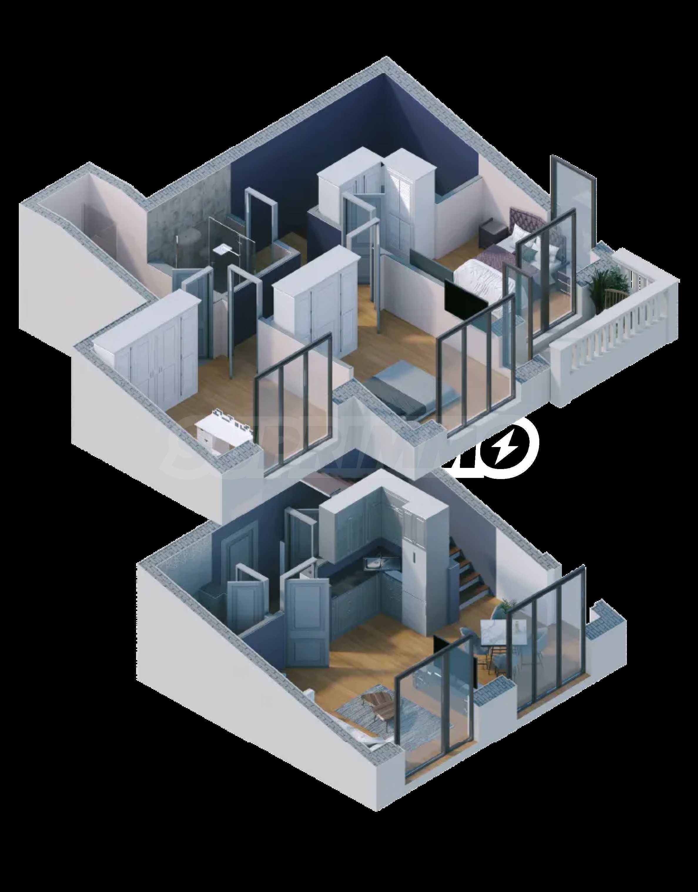 Apartament znajduje się na 1 i 2 piętrze spośród 4 apartamentów i ma powierzchnię całkowitą 121,48 mkw. (część mieszkalna - 109,24 mkw., części wspólne - 12,24 mkw.) oraz ogródek o powierzchni 41,42 mkw.