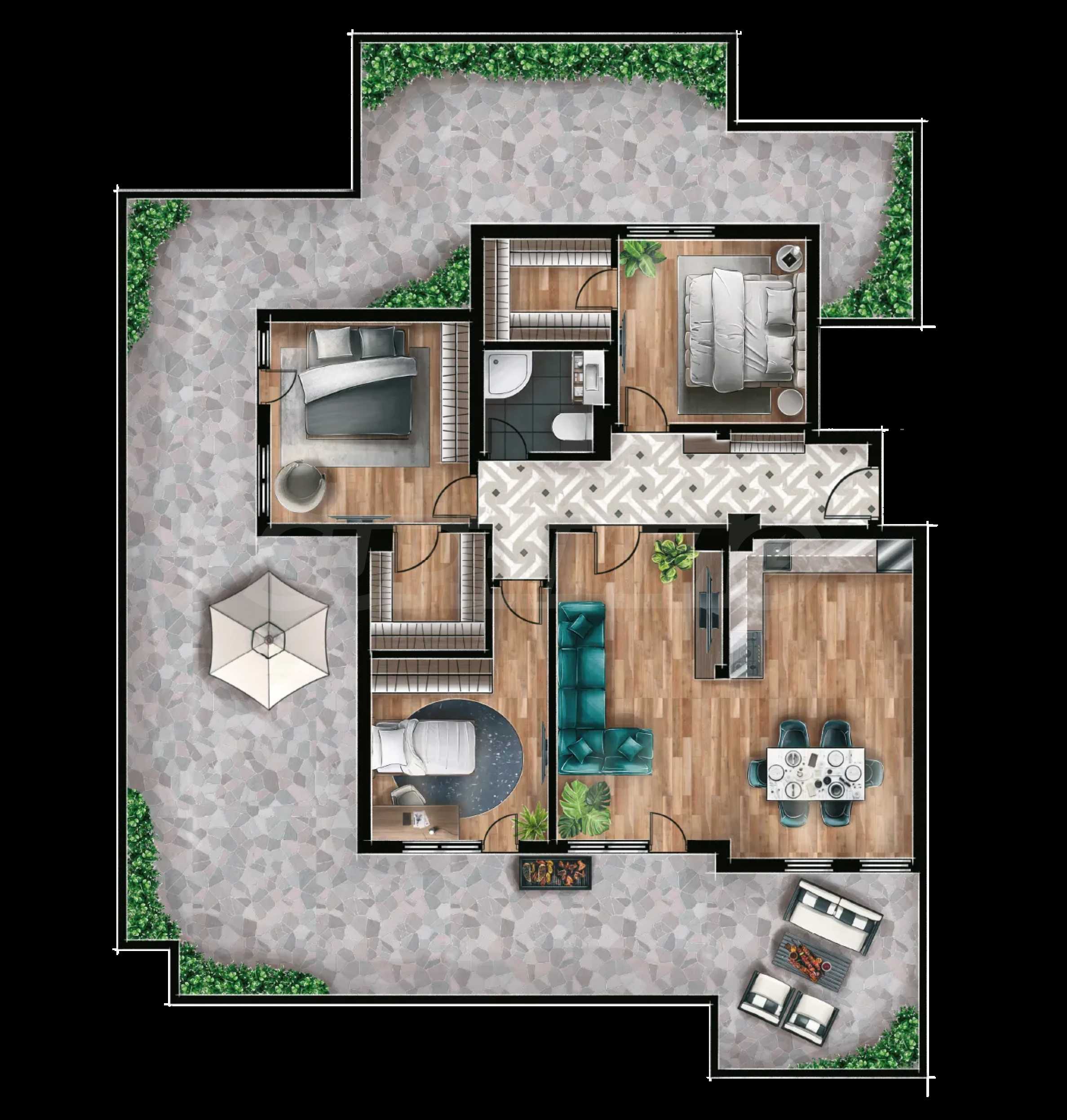 Prezentujemy czteropokojowy apartament z przestronnym tarasem w nowym, ogrodzonym kompleksie z 7-akrowym parkiem, odkrytym basenem i wieloma innymi udogodnieniami dla mieszkańców. Obiekt położony jest w spokojnej, miejskiej okolicy – w miejscowości Bankja, światowej sławy uzdrowisku balneologicznym i SPA, słynącym z leczniczych wód i czystego powietrza. Bankja oferuje szybki i łatwy dostęp do udogodnień stolicy, a centrum Sofii oddalone jest o 15 km.