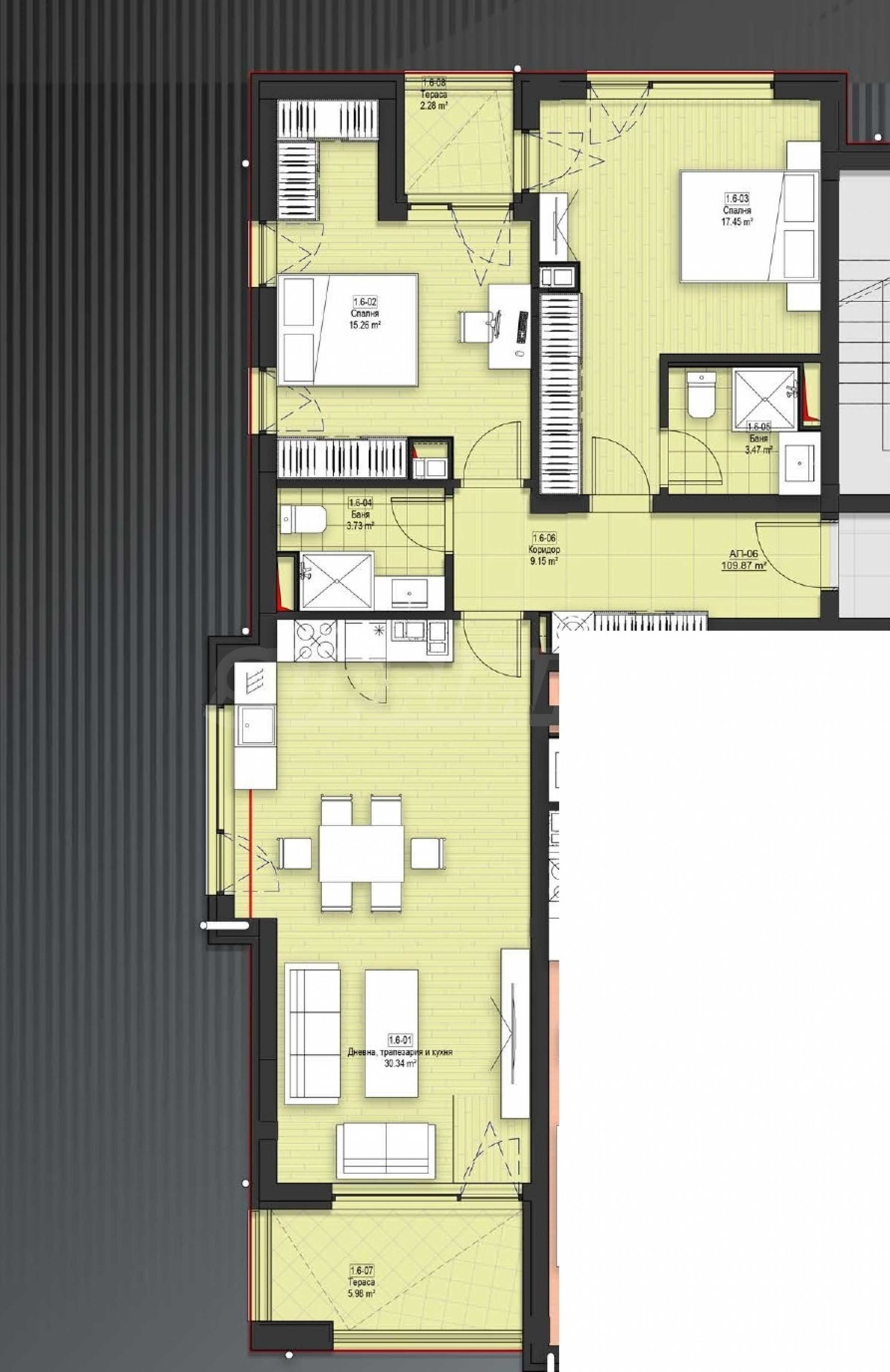 Nieruchomość znajduje się na 2 piętrze i składa się z przestronnego salonu z tarasem od strony wschodniej i oknem południowym (30 m2), dwóch sypialni od strony zachodniej (15 m2 i 18 m2), jedna sypialnia ma własną łazienkę, taras, na który można wyjść z obu sypialni, a także drugiej łazienki.