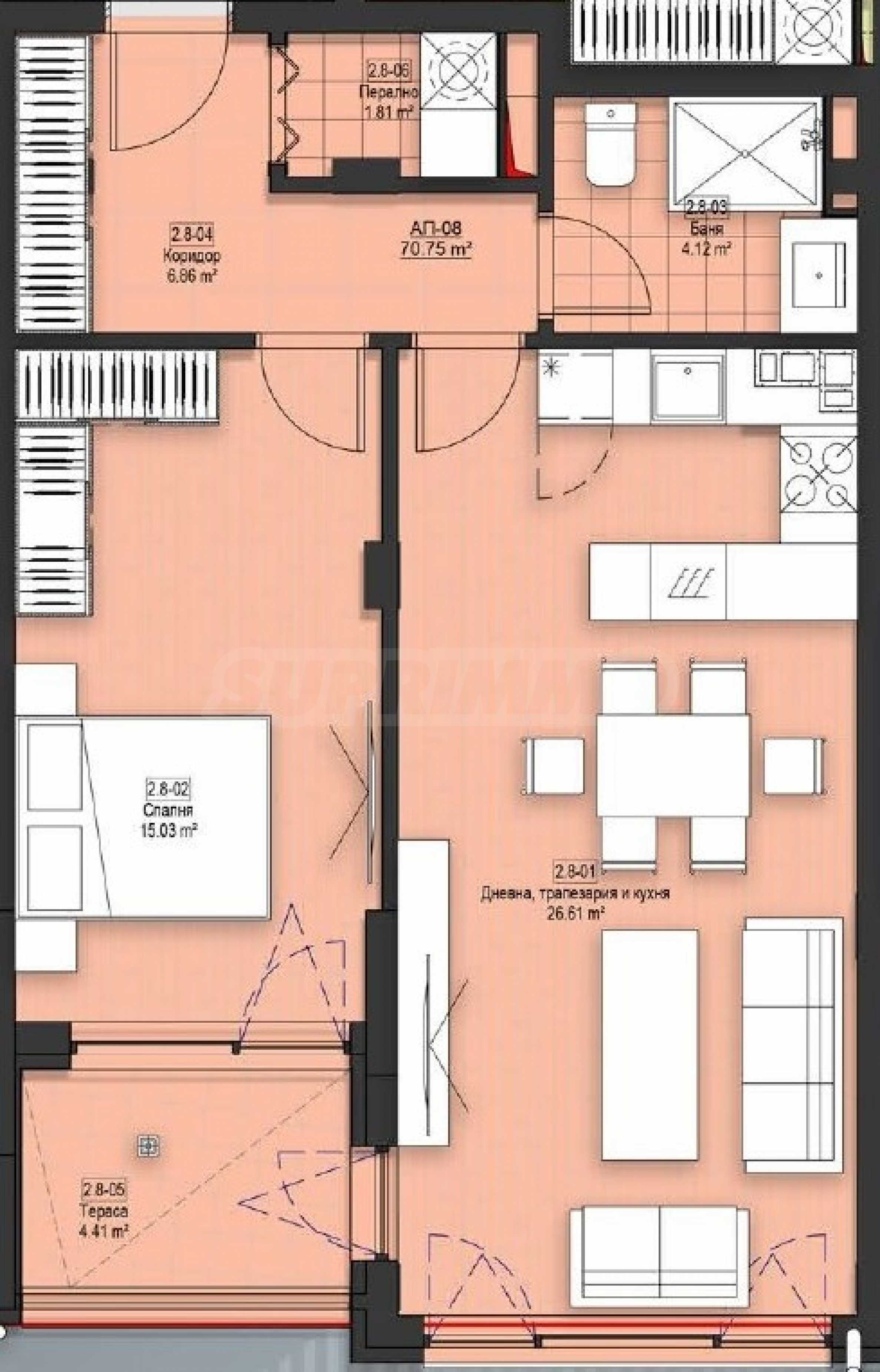 Oferujemy na sprzedaż dwupokojowe mieszkanie w butikowym budynku w budowie, w stanie deweloperskim – ACT 16. Nieruchomość położona jest w miejscowości Lozen, przy ulicy Saedinenie, w pobliżu centrum miejscowości, urzędu gminy, przystanków komunikacji miejskiej i sklepów. Nieruchomość oferuje wyjątkową możliwość połączenia życia miejskiego z naturalnym. Bliskość autostrady Trakia sprawia, że nieruchomość jest idealna dla osób często podróżujących i potrzebujących szybkiego dostępu do głównych dróg. W 5 minut samochodem można dotrzeć do stacji metra Expo Center przy bulwarze Tsarigradsko Shose, a w 7 minut – do stacji metra Business Park przy ulicy Mladost 4.