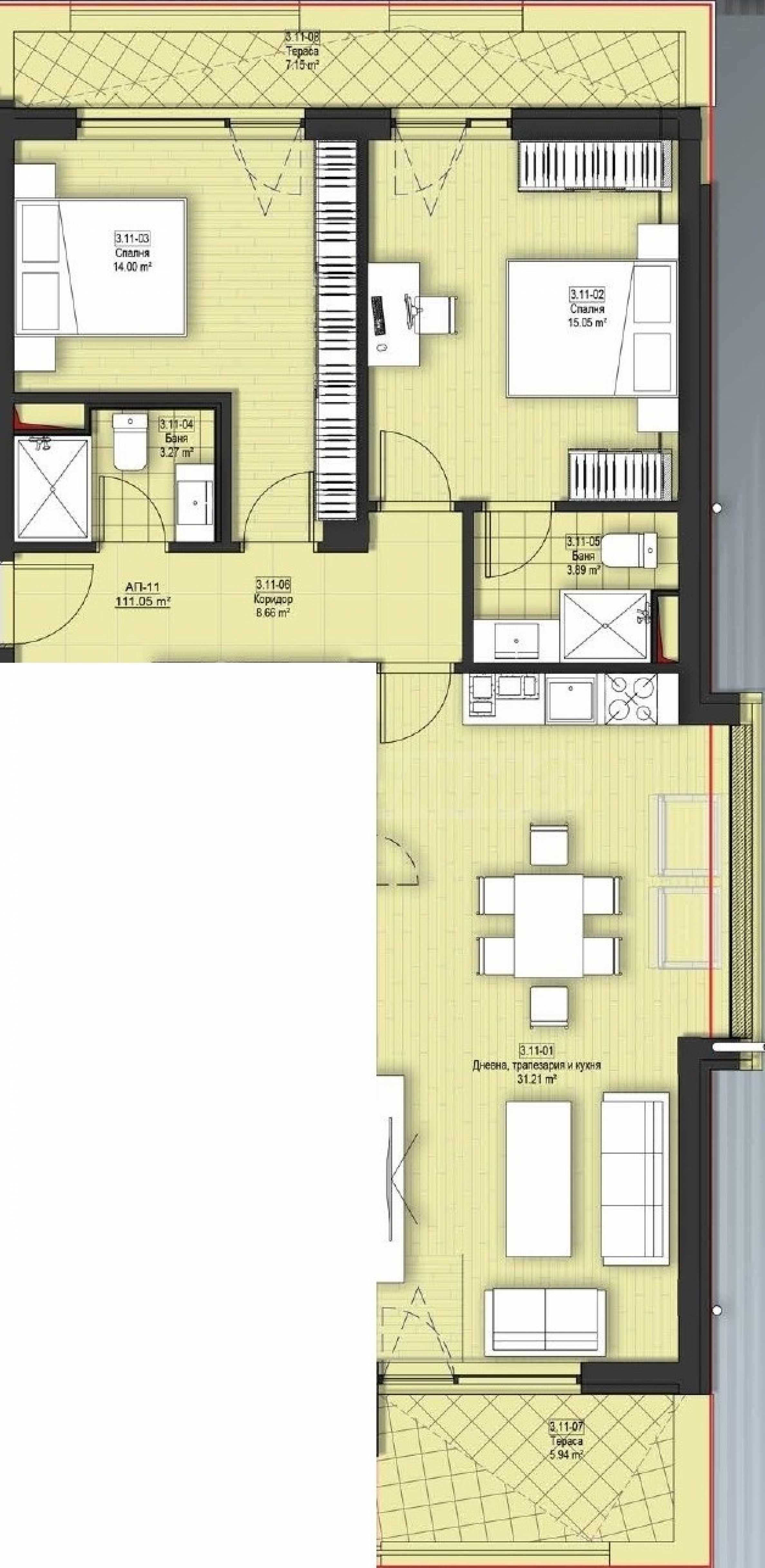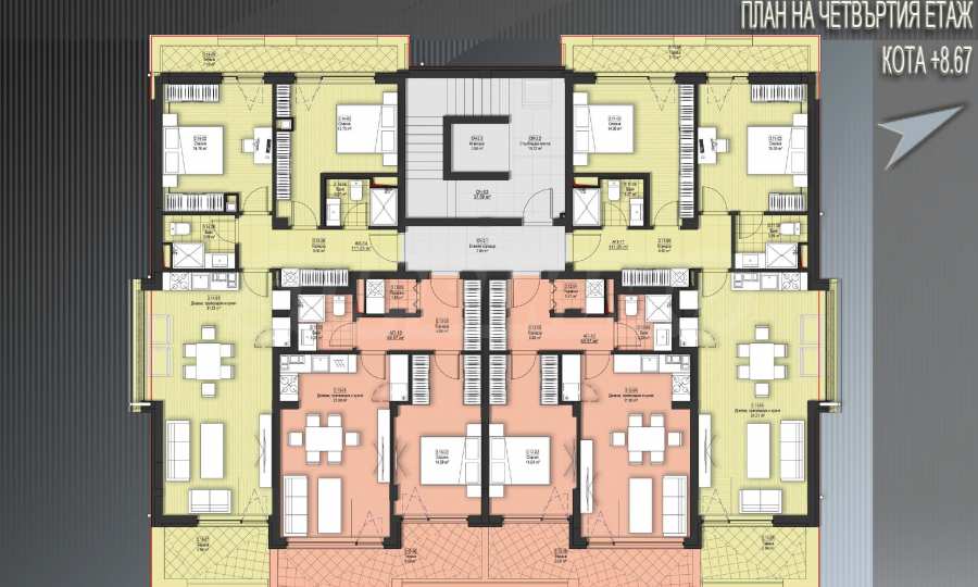 Nieruchomość znajduje się na czwartym piętrze i składa się z przestronnego salonu z tarasem od strony wschodniej i oknem od strony północnej (30 m2), dwóch sypialni od strony północno-zachodniej (15 m2 i 18 m2), jednej sypialni z własną łazienką, tarasu, na który można wyjść z obu sypialni, a także drugiej łazienki.