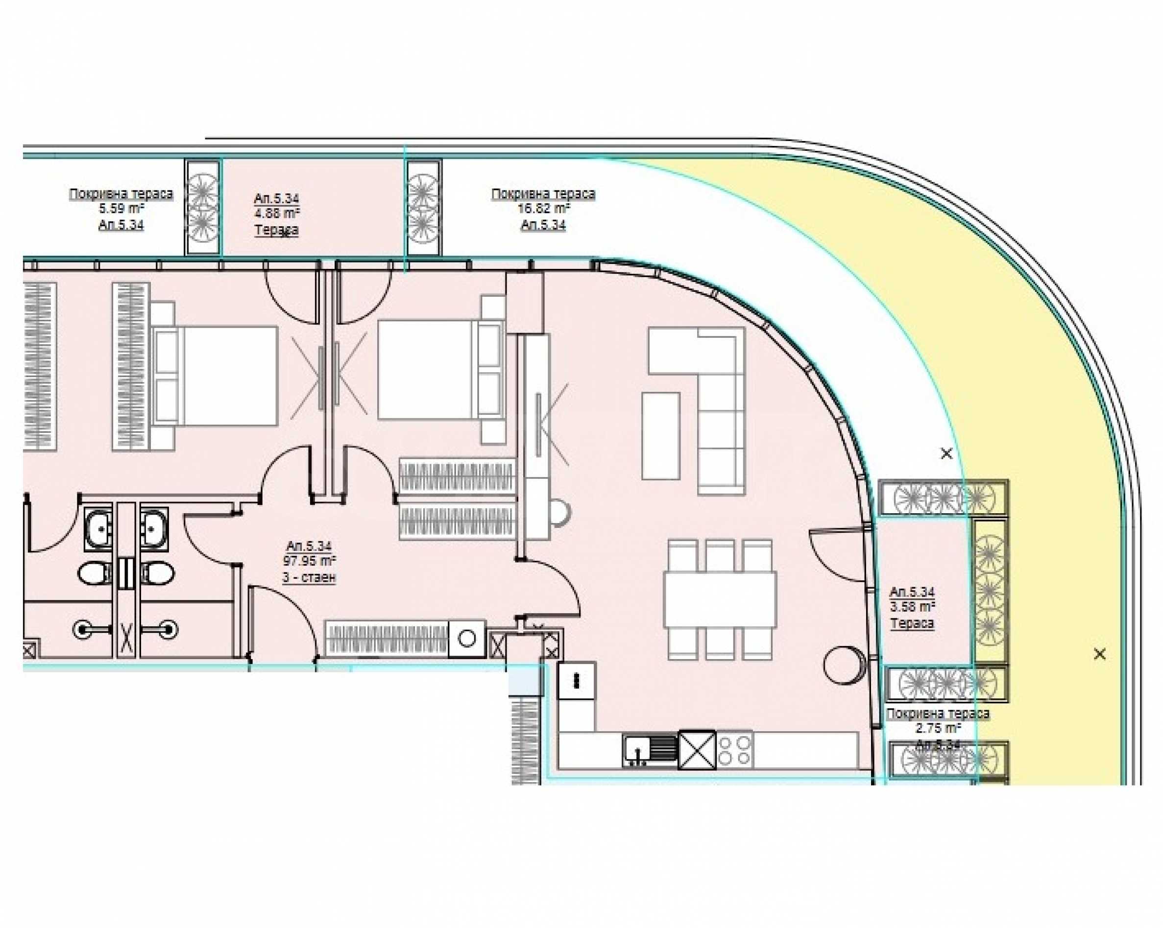 Apartament 5.34 znajduje się na 5. piętrze z 15 i oferuje 130,05 m² powierzchni całkowitej – 106,41 m² powierzchni netto oraz 23,64 m² powierzchni wspólnych. Do nieruchomości przynależy dodatkowy taras o powierzchni 25,16 m². Składa się z przedpokoju, salonu z aneksem kuchennym, dwóch sypialni, dwóch łazienek z toaletą oraz tarasów.