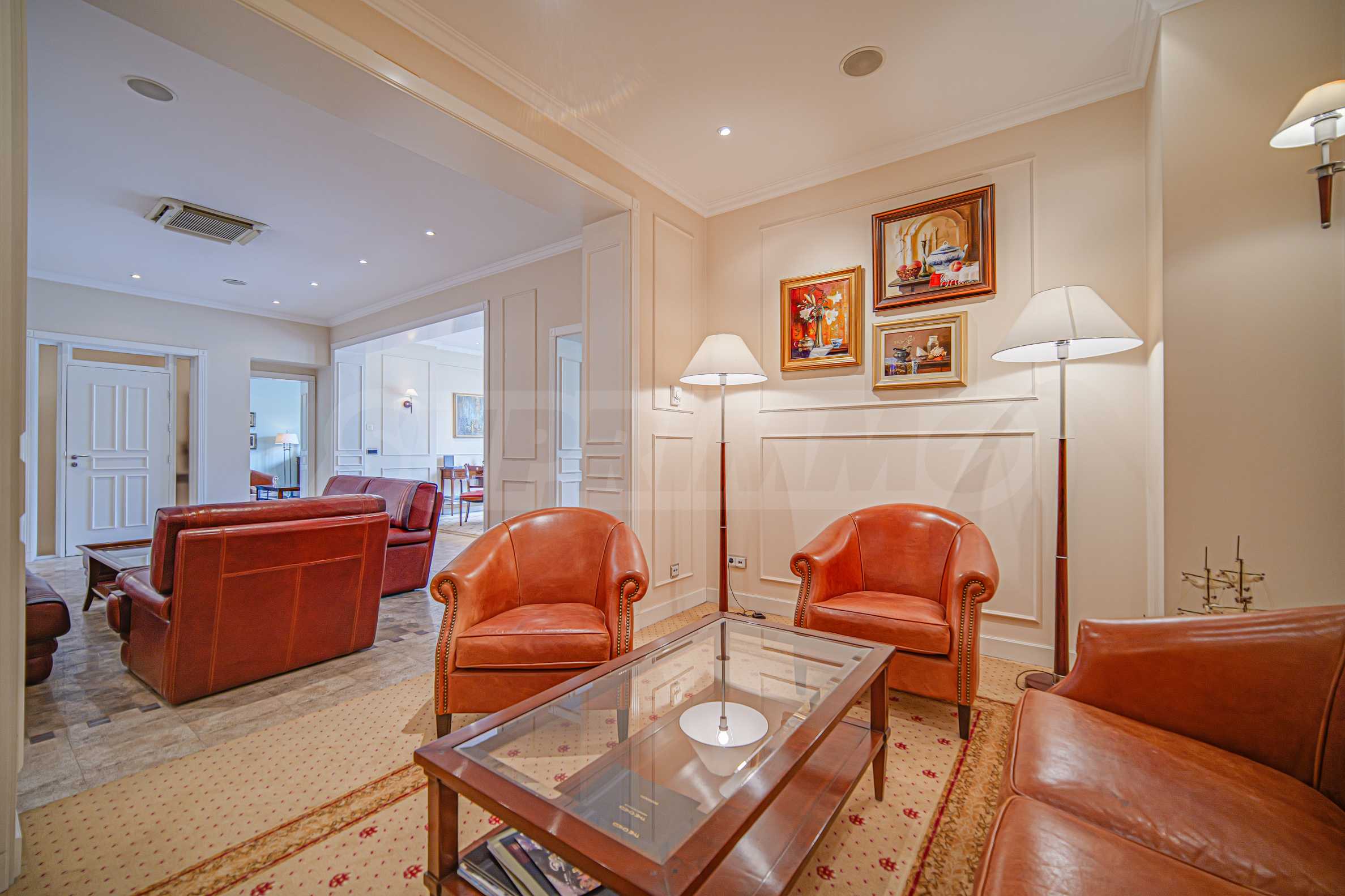 - duży pokój z 2 narożnikami z kanapami, jeden z kominkiem, wysoki stół konferencyjny;