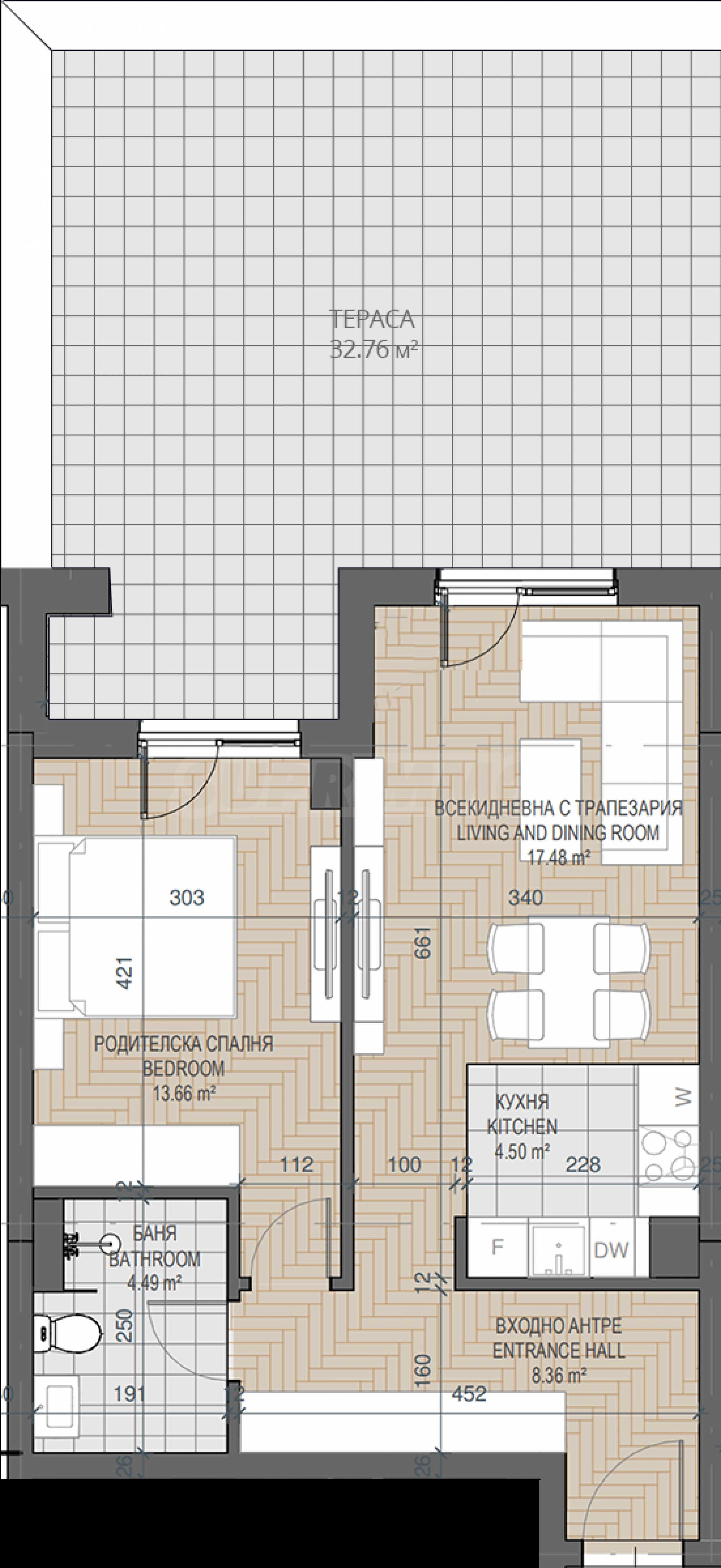 - salon z aneksem kuchennym - 17,48 m2 i 4,50 m2;