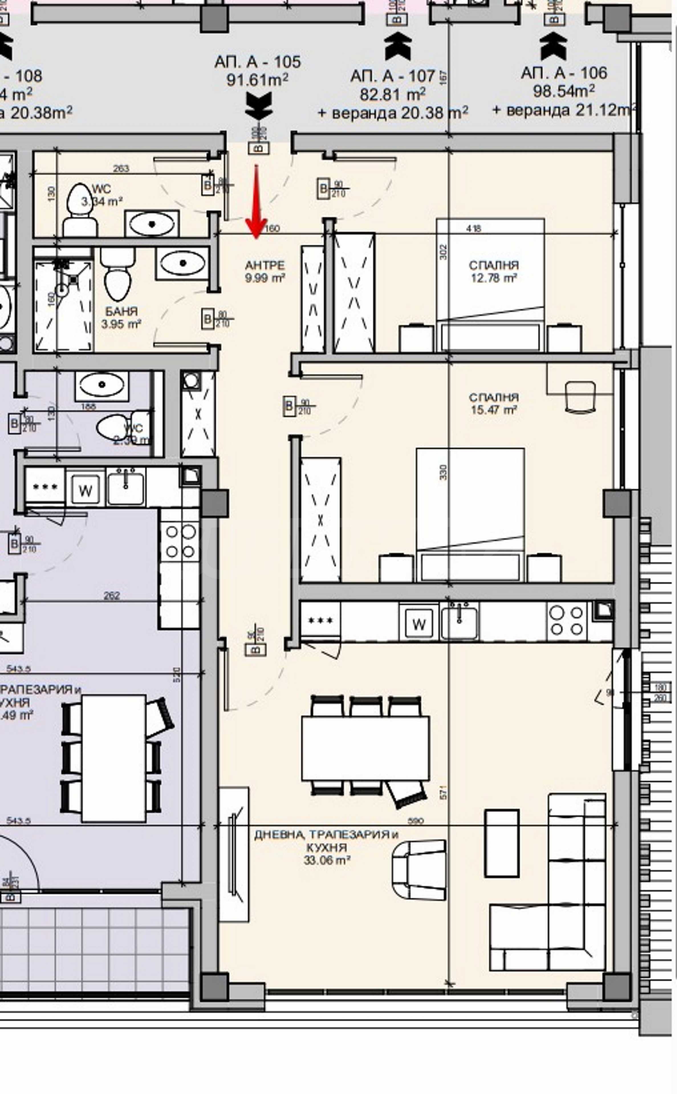Nieruchomość znajduje się na 1. piętrze i oferuje powierzchnię całkowitą 112,75 m² (powierzchnia netto 91,62 m² + powierzchnie wspólne 21,13 m²). Składa się z przedpokoju, salonu z aneksem kuchennym, dwóch sypialni, łazienki i toalety.