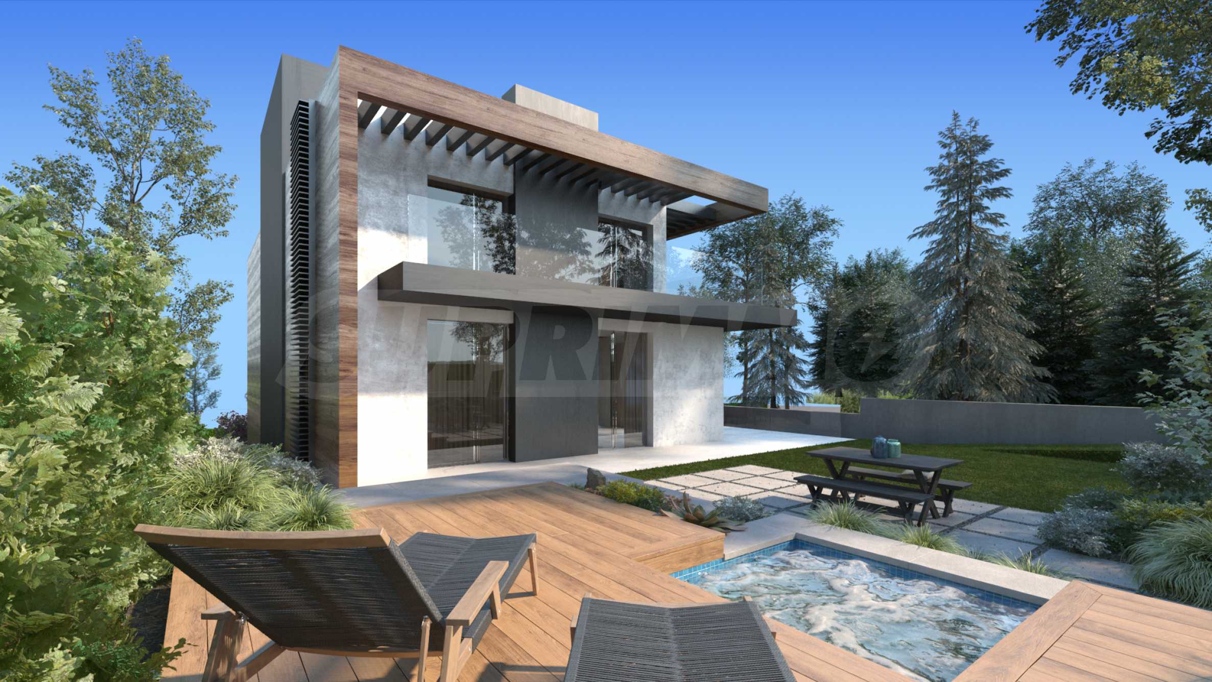- drugie piętro: sypialnia główna z prywatną łazienką i werandą, 3 sypialnie z prywatnymi łazienkami i toaletami, duże tarasy;