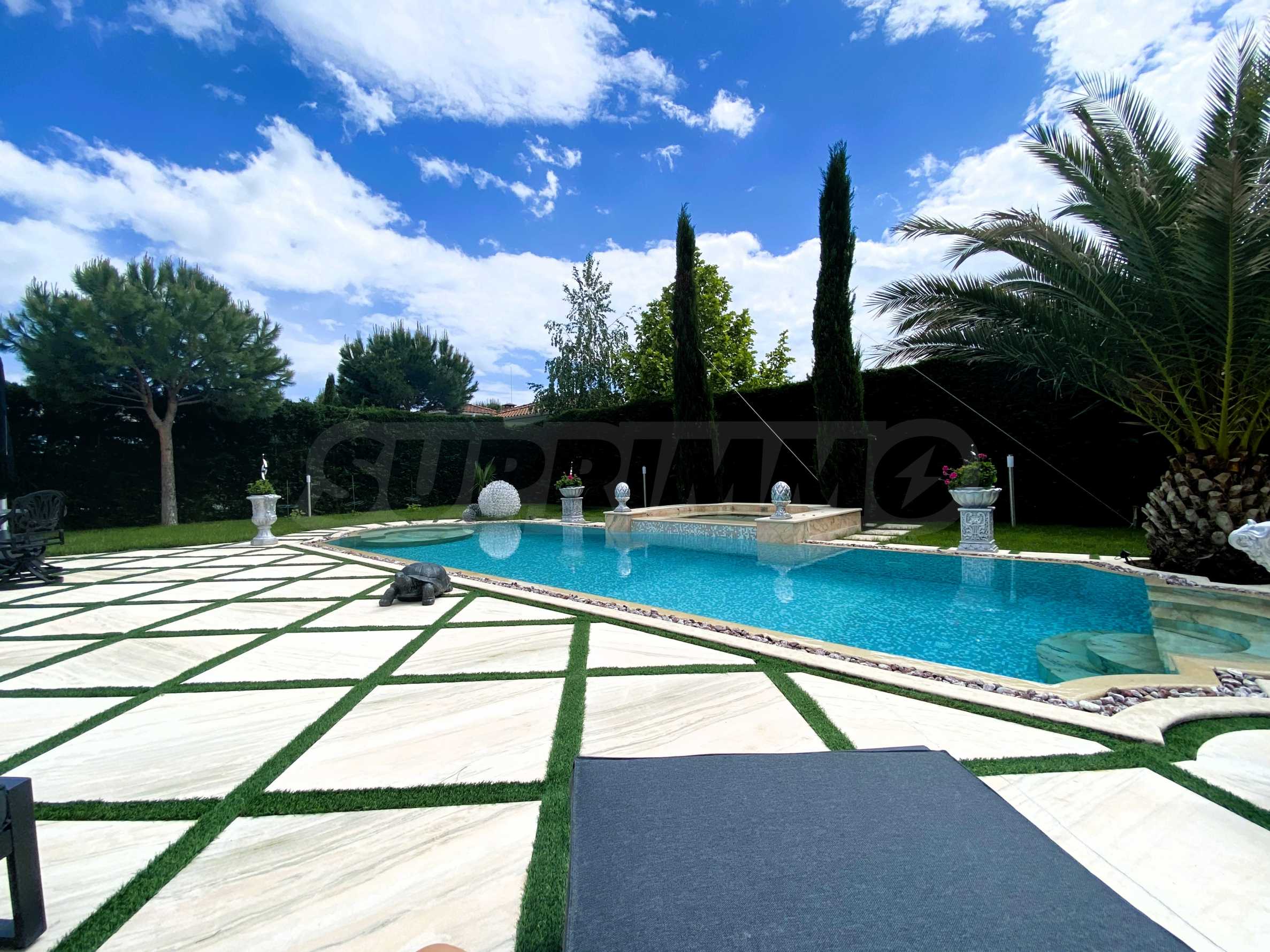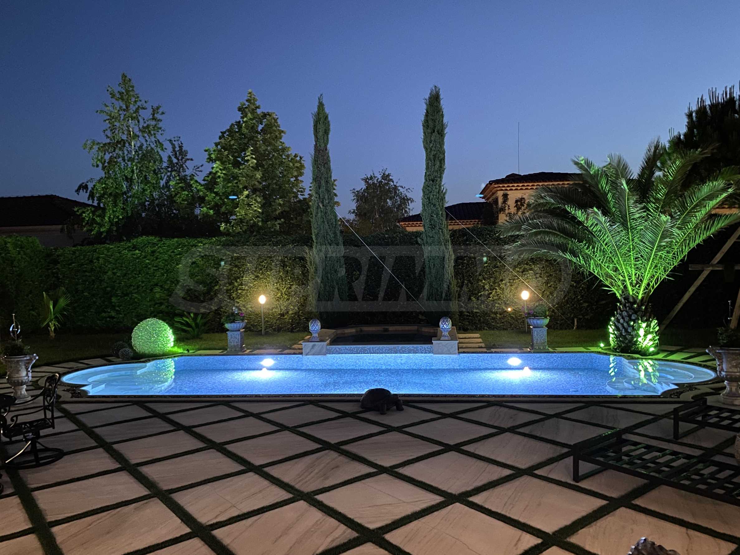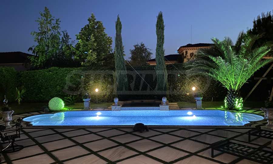 W bogato zagospodarowanym ogrodzie z egzotycznymi drzewami i kwiatami znajduje się centralnie położony basen z jacuzzi, w całości wyłożony kamieniem naturalnym „Rosso portogalo”. Posiada również zadaszone miejsce parkingowe obok wejścia.