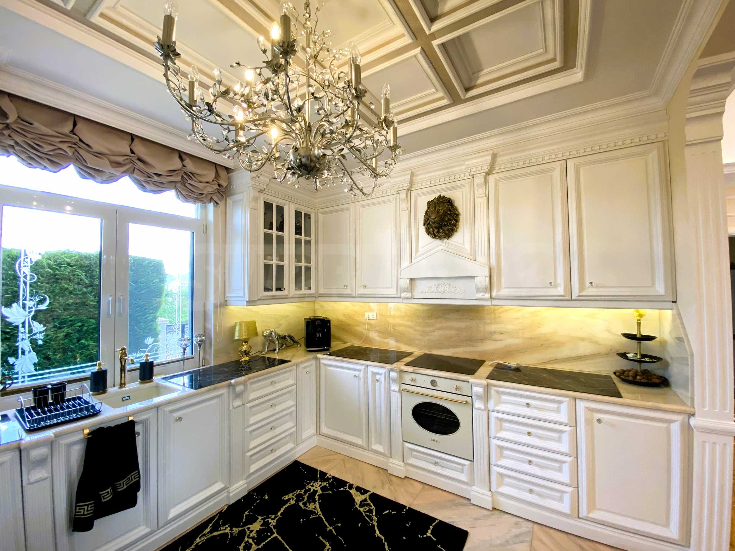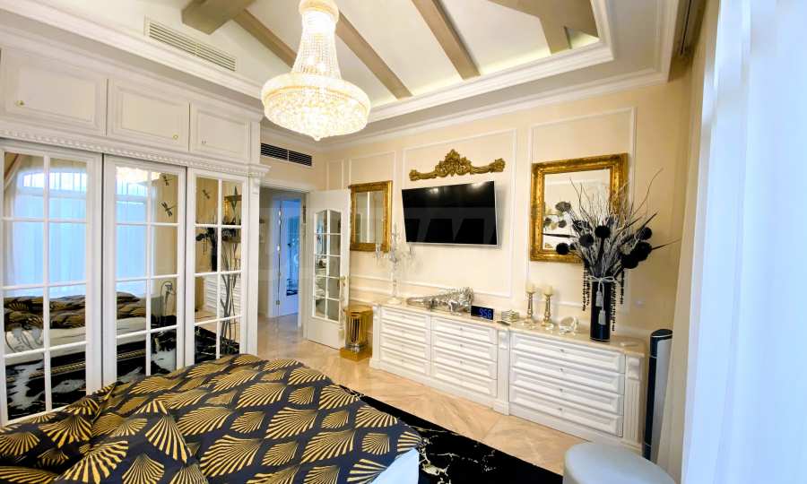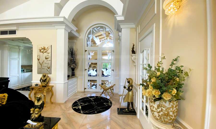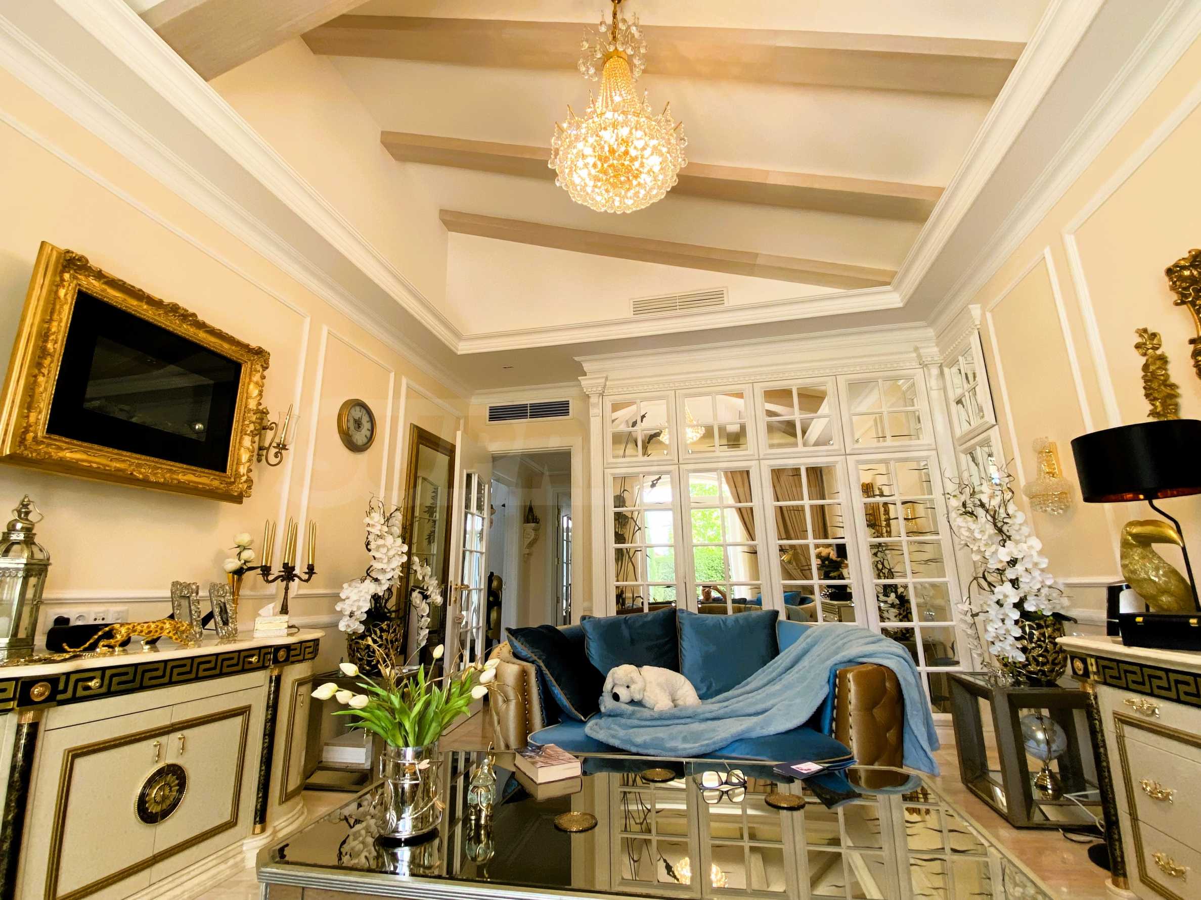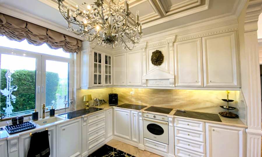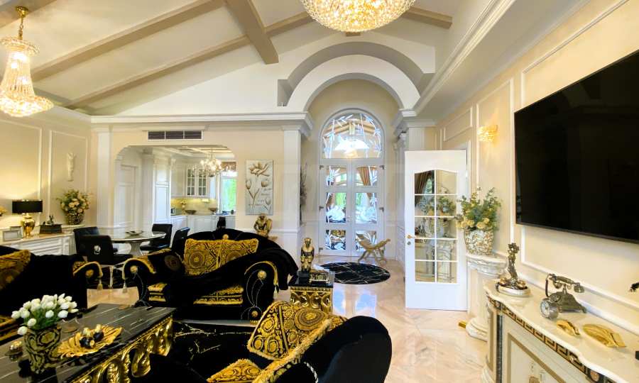 Willa jest elegancko urządzona meblami wykonanymi na zamówienie. We wnętrzu zastosowano luksusowe, naturalne materiały, marmur „Rosso portogalo” i drewno.