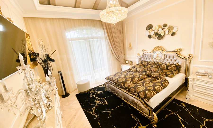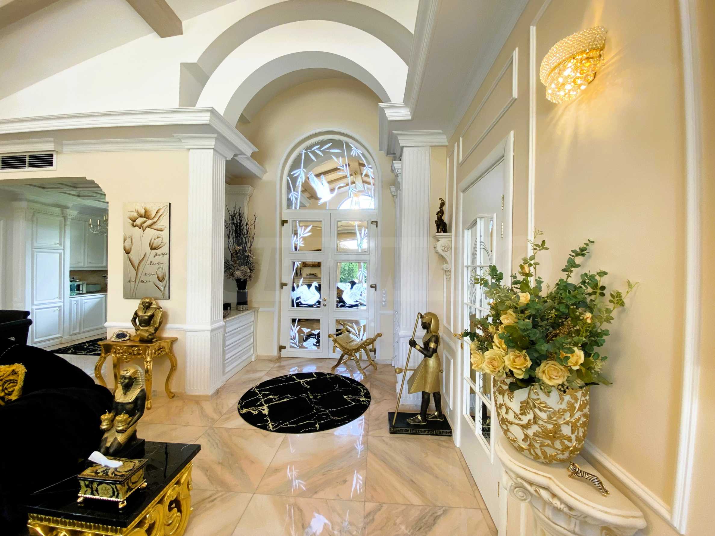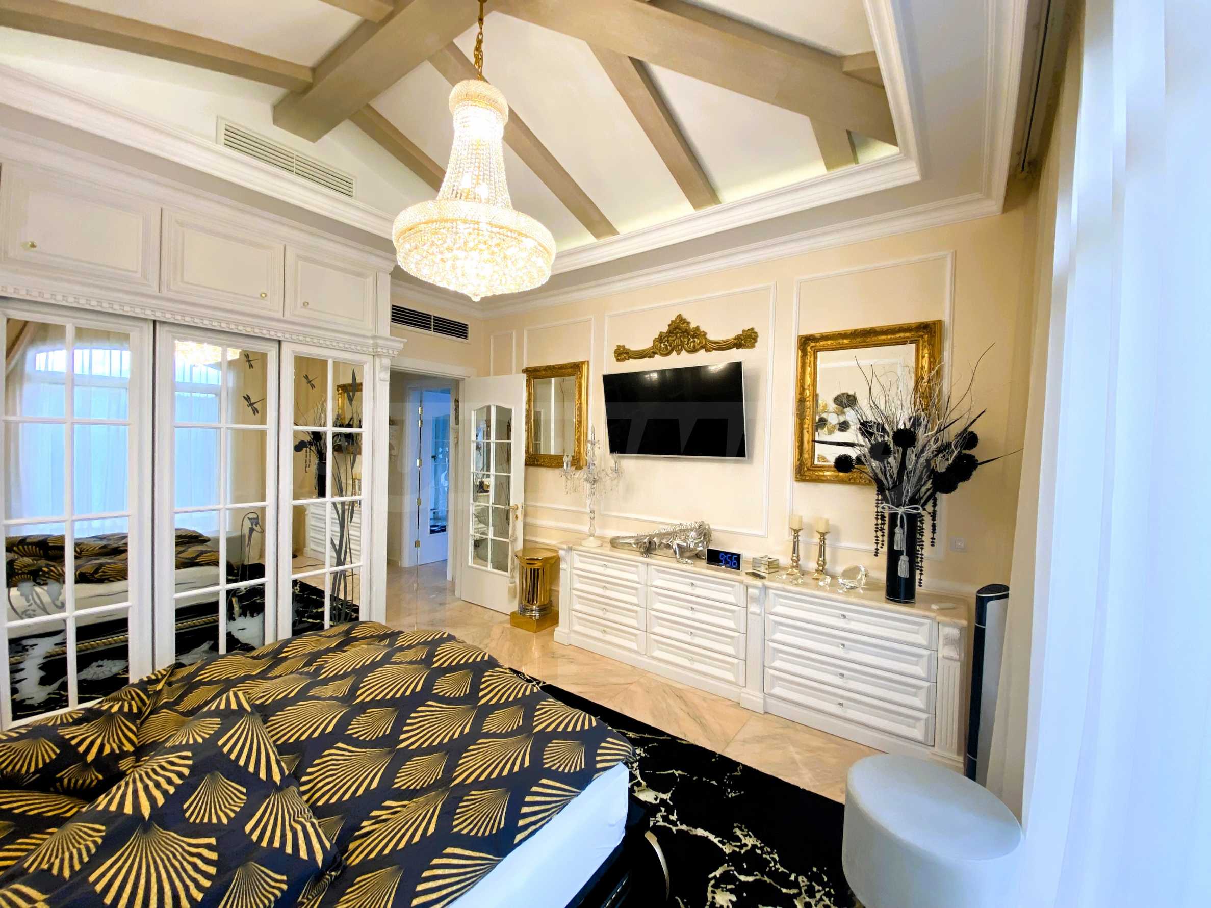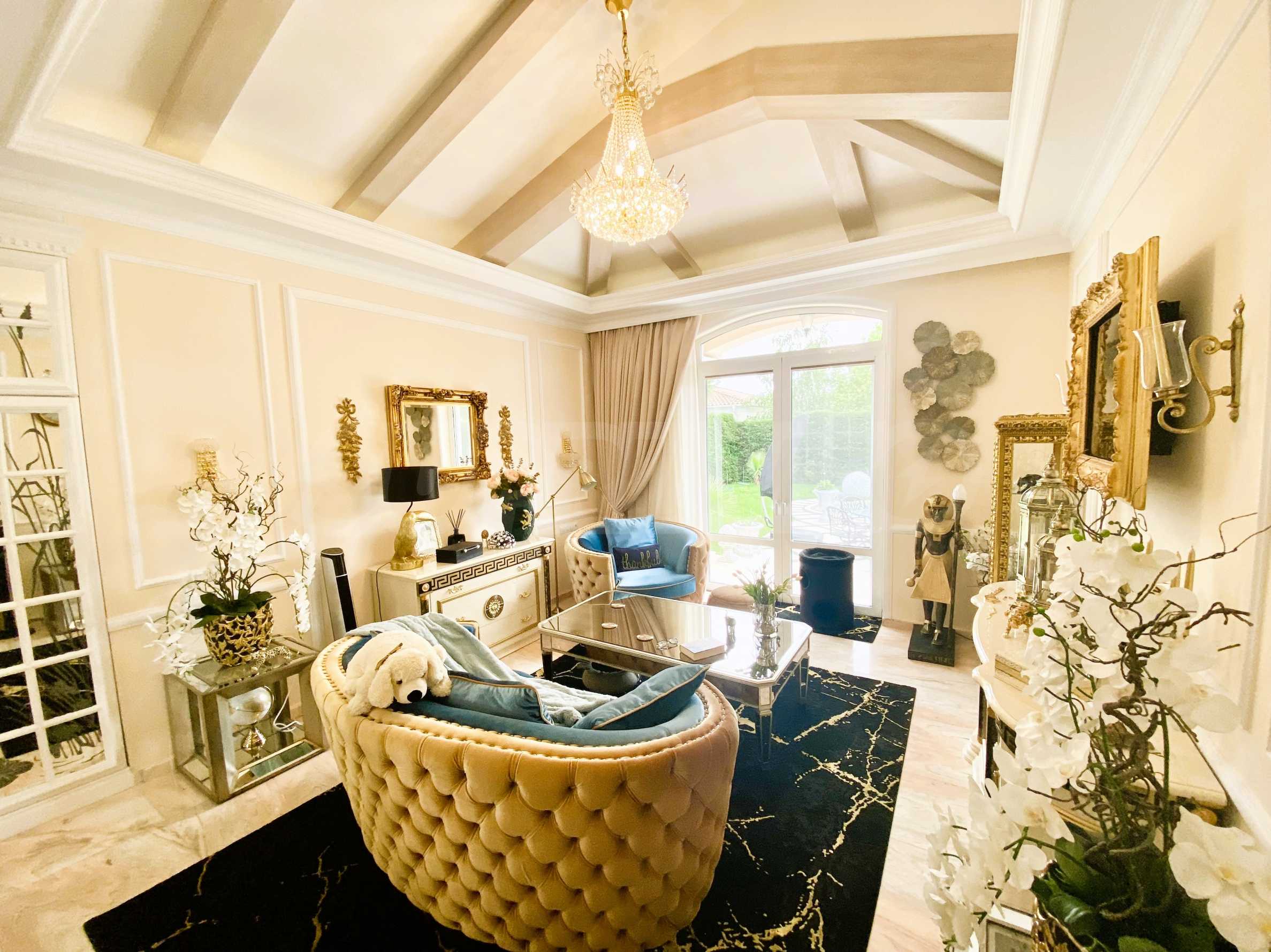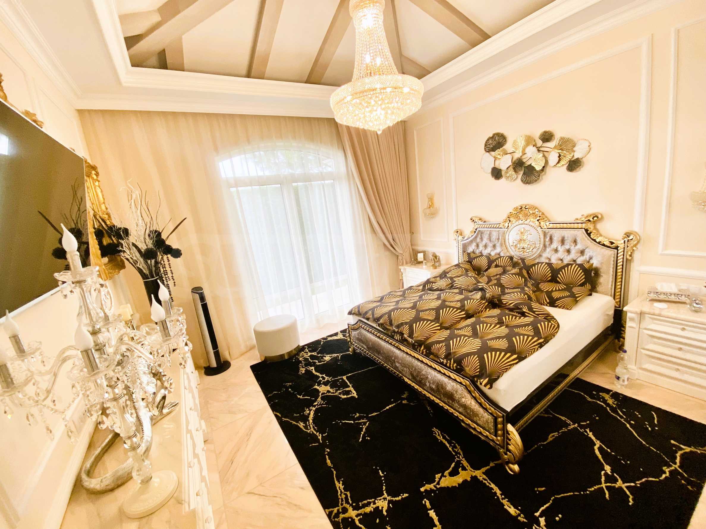 Willa jest elegancko urządzona meblami wykonanymi na zamówienie. We wnętrzu zastosowano luksusowe, naturalne materiały, marmur „Rosso portogalo” i drewno.