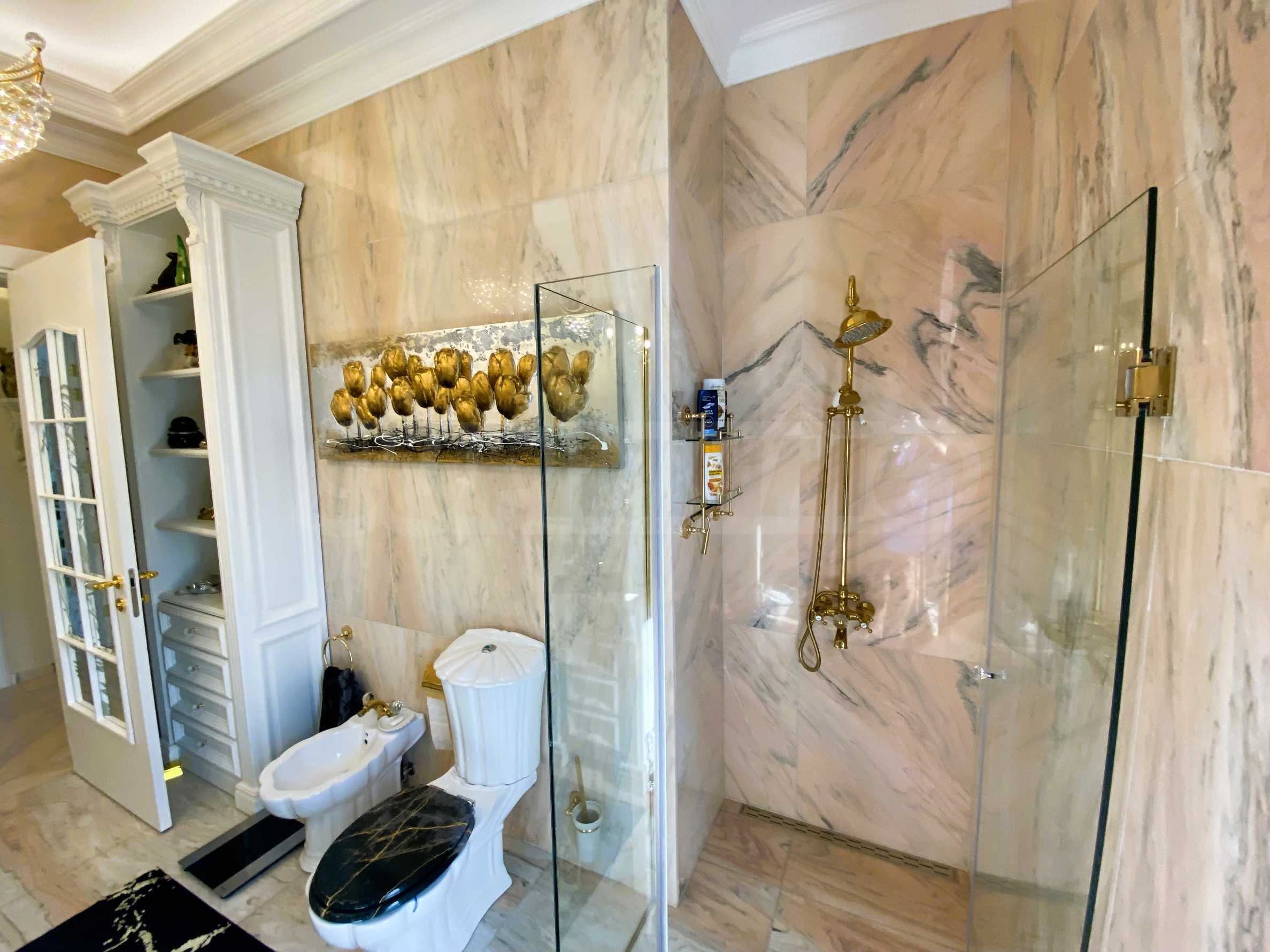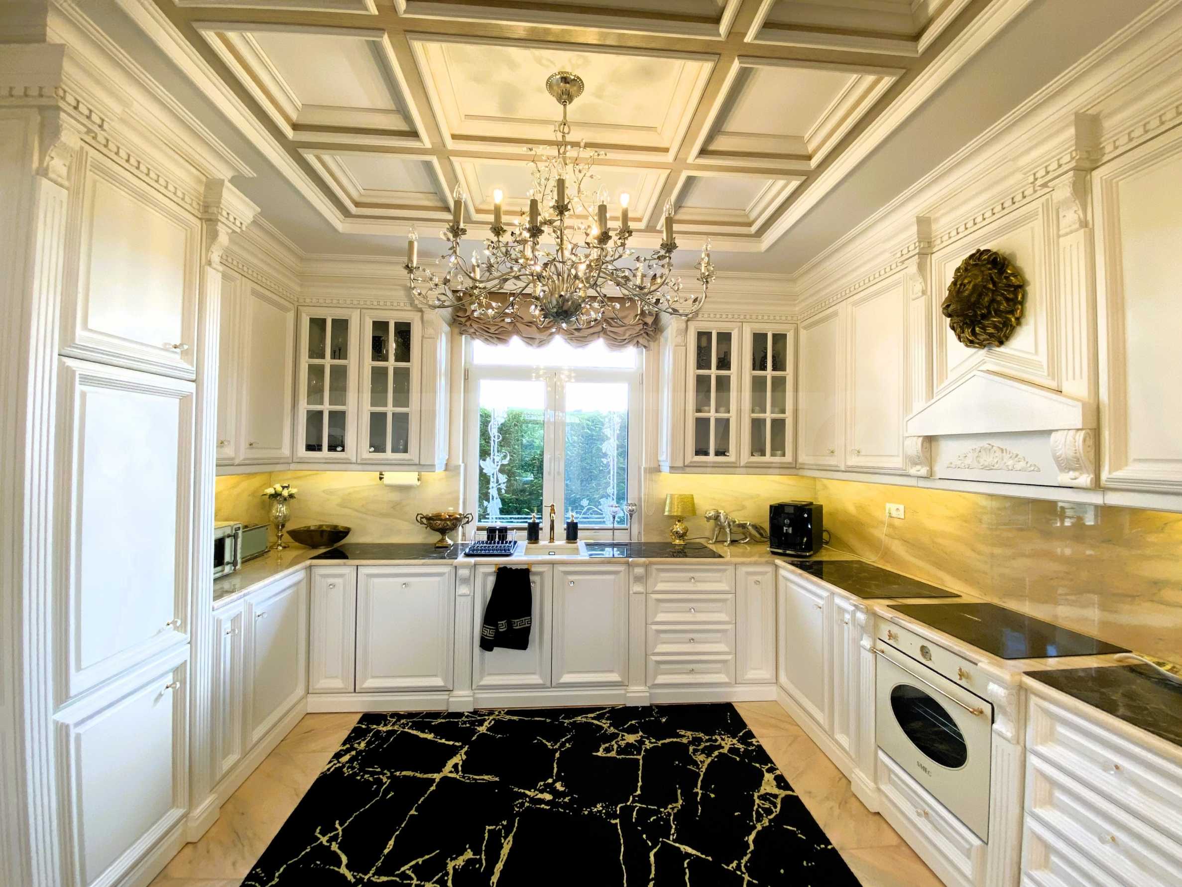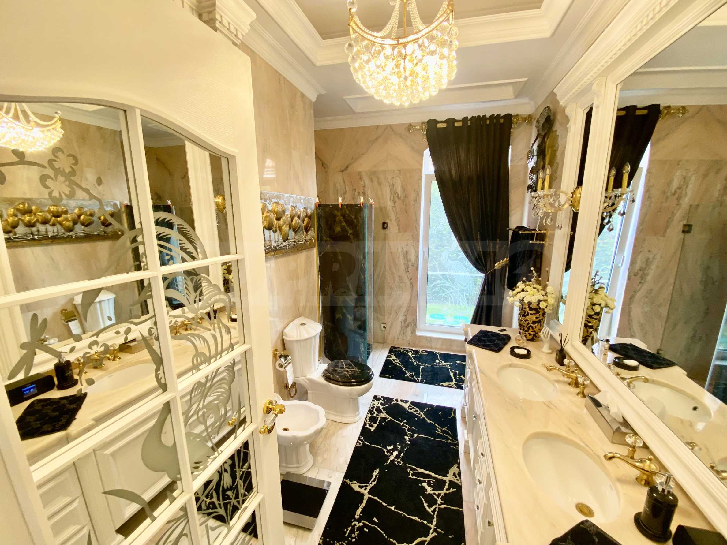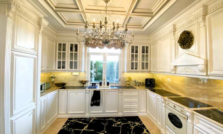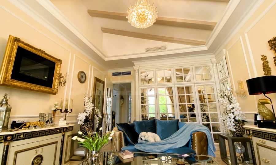Willa jest elegancko urządzona meblami wykonanymi na zamówienie. We wnętrzu zastosowano luksusowe, naturalne materiały, marmur „Rosso portogalo” i drewno.