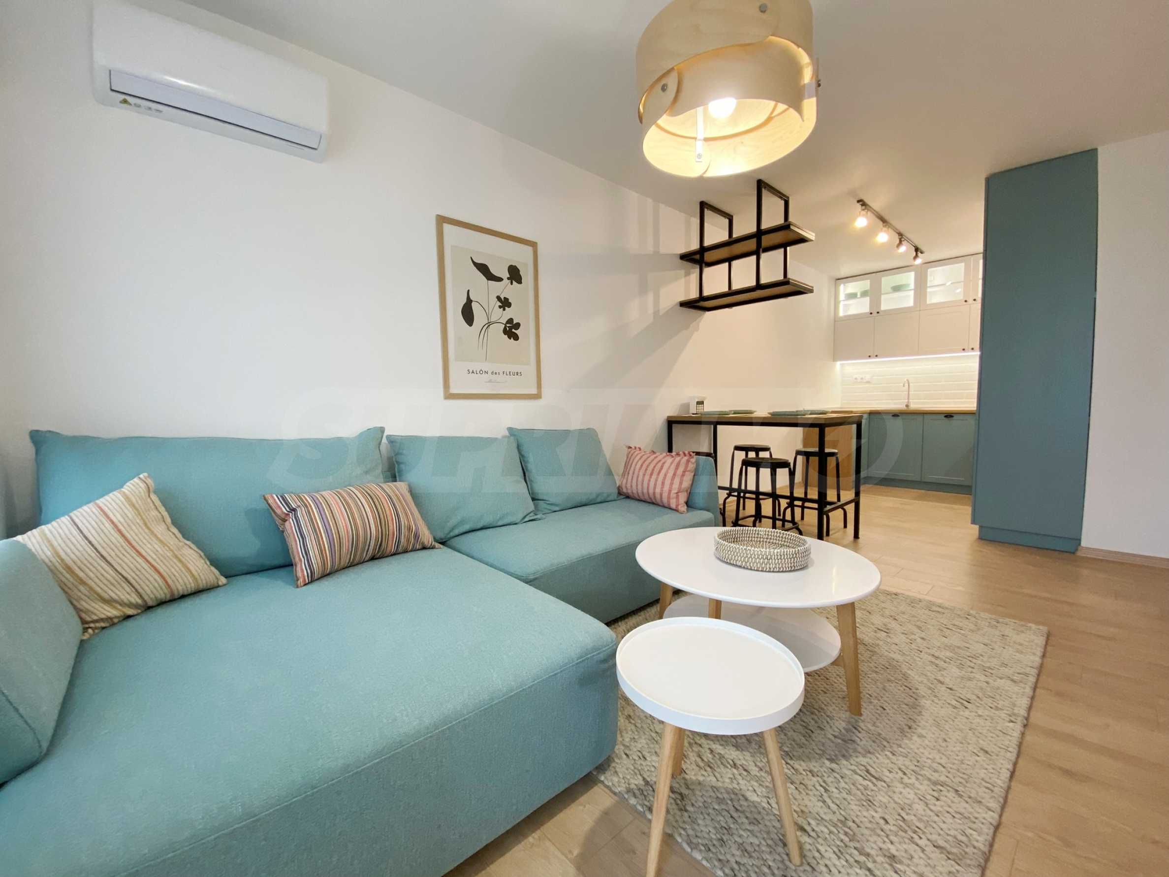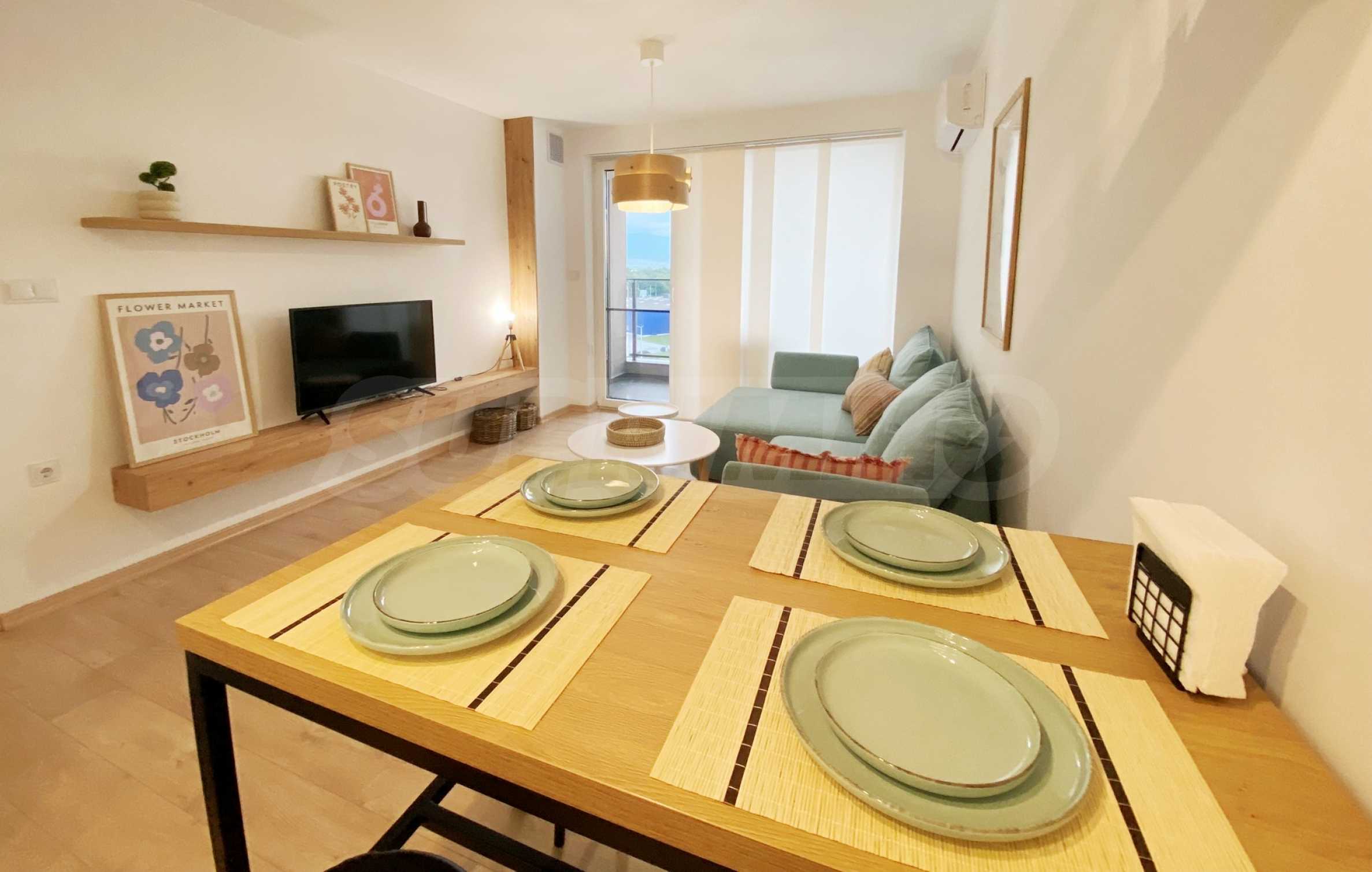 Apartament jest w pełni umeblowany i wyposażony w nowe, nowoczesne meble oraz sprzęt AGD najwyższej klasy z gwarancją. Zachwyca czystym, jasnym wnętrzem w stylu boho. Ogrzewanie i chłodzenie zapewniają ekonomiczne klimatyzatory inwerterowe w każdym pomieszczeniu.