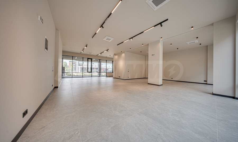 W części handlowej budynku zlokalizowanych jest łącznie 5 lokali handlowych. Są one zorganizowane na 2 poziomach (z wyjątkiem najmniejszego obiektu, który znajduje się na jednym poziomie). Poziom górny zlokalizowany jest na parterze budynku (piętro „0”), natomiast poziom dolny zlokalizowany jest na pierwszej kondygnacji podziemnej budynku (piętro „-1”). Obydwa poziomy łączy wewnętrzna klatka schodowa, indywidualna dla każdego obiektu. Każde z wejść do lokali usługowych zlokalizowane jest bezpośrednio na parterze budynku i ma bezpośrednie wejście z ulicy. Sama część handlowa została oddzielona od wejść do części mieszkalnej i biurowej budynku. Dostępne powierzchnie sklepów wahają się od 106,32 m2 do 259,76 m2 łącznie z powierzchniami wspólnymi. Główne i większe witryny sklepowe lokali handlowych zlokalizowane są na parterze, zwrócone w stronę zachodniej elewacji budynku, od strony ulicy „Simeonovsko Shosse”. Obiekty posiadają także niewielkie witryny sklepowe po drugiej, wschodniej stronie budynku, dzięki czemu są one widoczne z obu długich elewacji budynku (elewacja wschodnia i zachodnia).