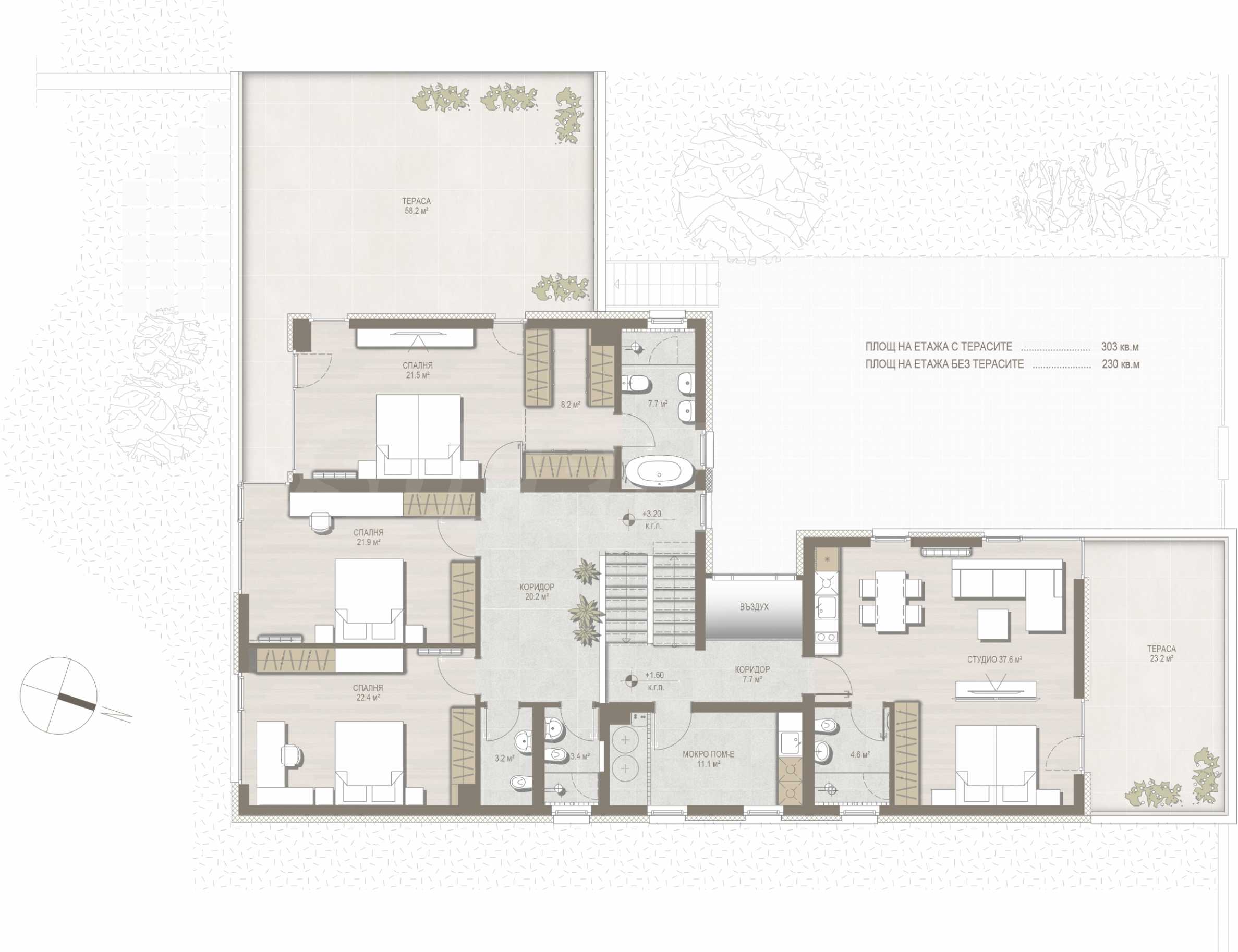 Drugie piętro: główna sypialnia z garderobą, łazienką i tarasem, dwie sypialnie, wszystkie od strony południowej, dwie łazienki, na półpoziomie: studio z łazienką i tarasem oraz pomieszczenie gospodarcze.