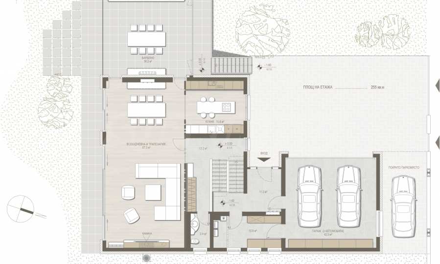 I piętro: salon i jadalnia na poziomie podwórza od strony południowej i skierowanej na południe, kuchnia, toaleta, grill, na półpoziomie: dwa garaże na dwa samochody, garderoba, przedsionek wejściowy, kolejne zadaszone miejsce parkingowe w przedpokoju dziedziniec;
