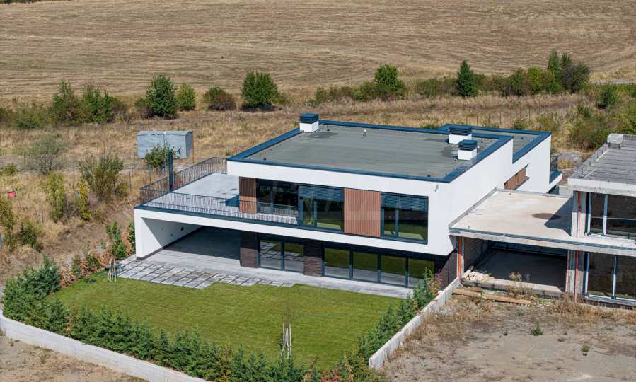 - Okna - aluminiowe z przerywanym mostkiem termicznym i potrójnymi szybami z ciepłą ramką Shueco, Niemcy, seria AWS 75SI, o niskim współczynniku przenikania ciepła, zawiasy ukryte, membrany wewnątrz i na zewnątrz na całym obwodzie (lub Reynaers tej samej klasy);