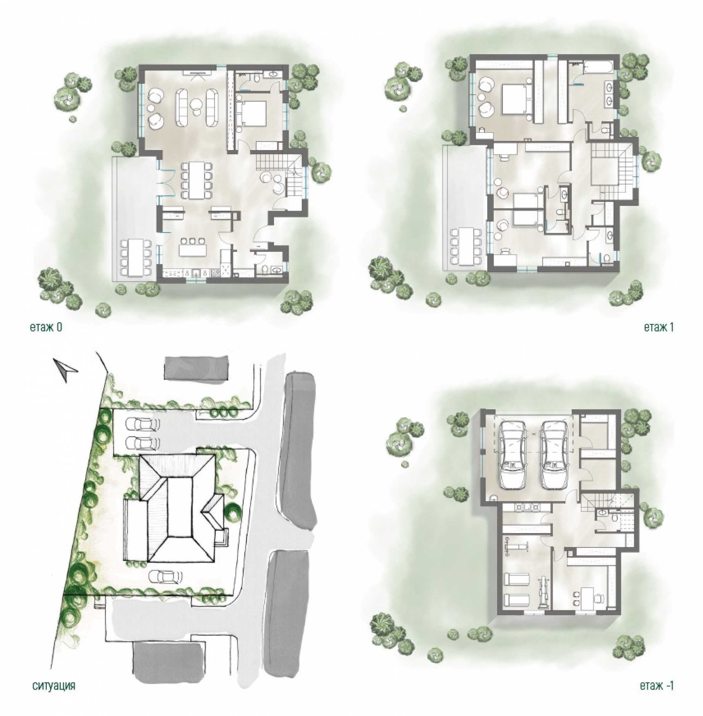 • Poziom piwnicy: podwójny garaż, miejsce parkingowe dla maksymalnie 4 samochodów, pomieszczenie gospodarcze, pomieszczenie techniczne, garderoba, łazienka z toaletą, pralnia, siłownia, oddzielne biuro/sypialnia.