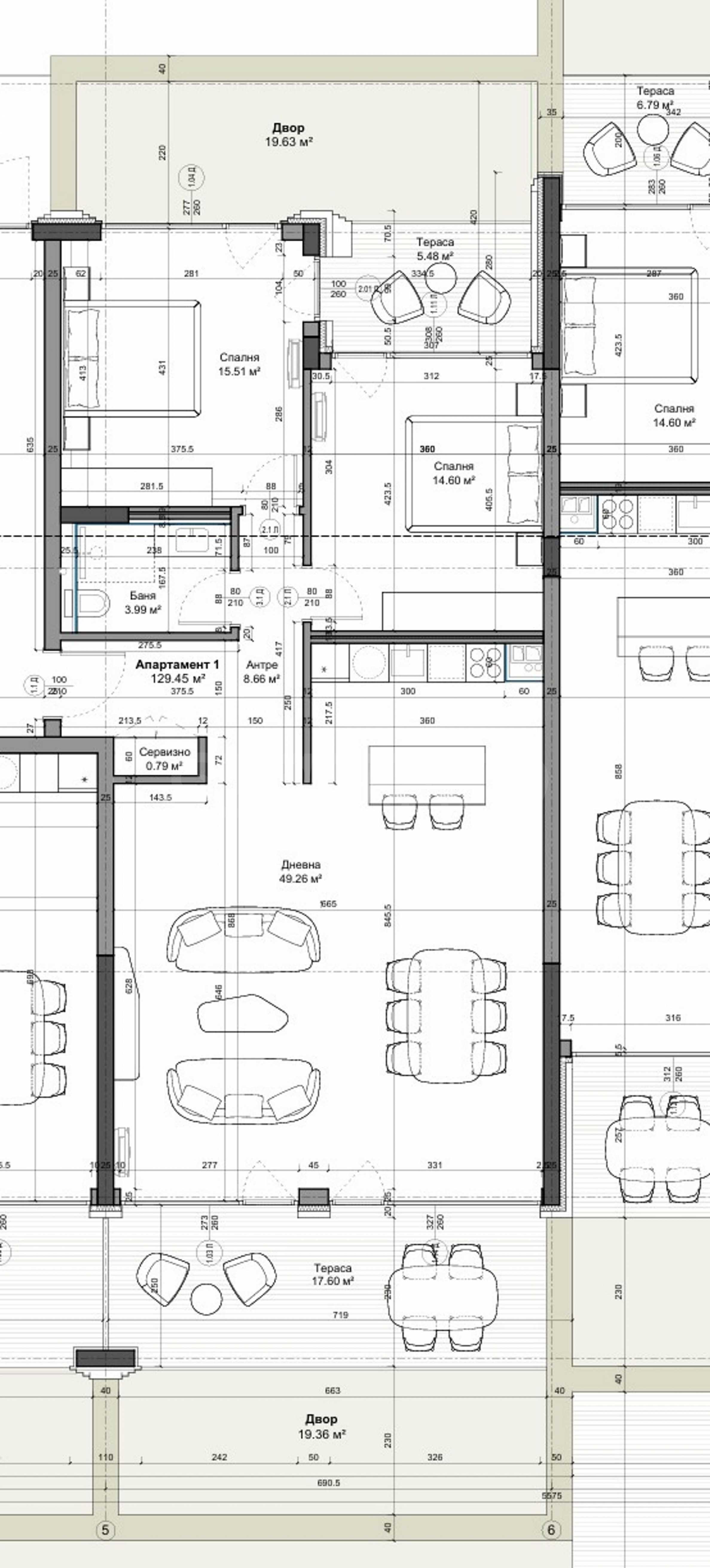 • salon z kuchnią i jadalnią, z dużym tarasem o powierzchni 17,60 m2 i wyjściem na podwórko - 19,36 m2.