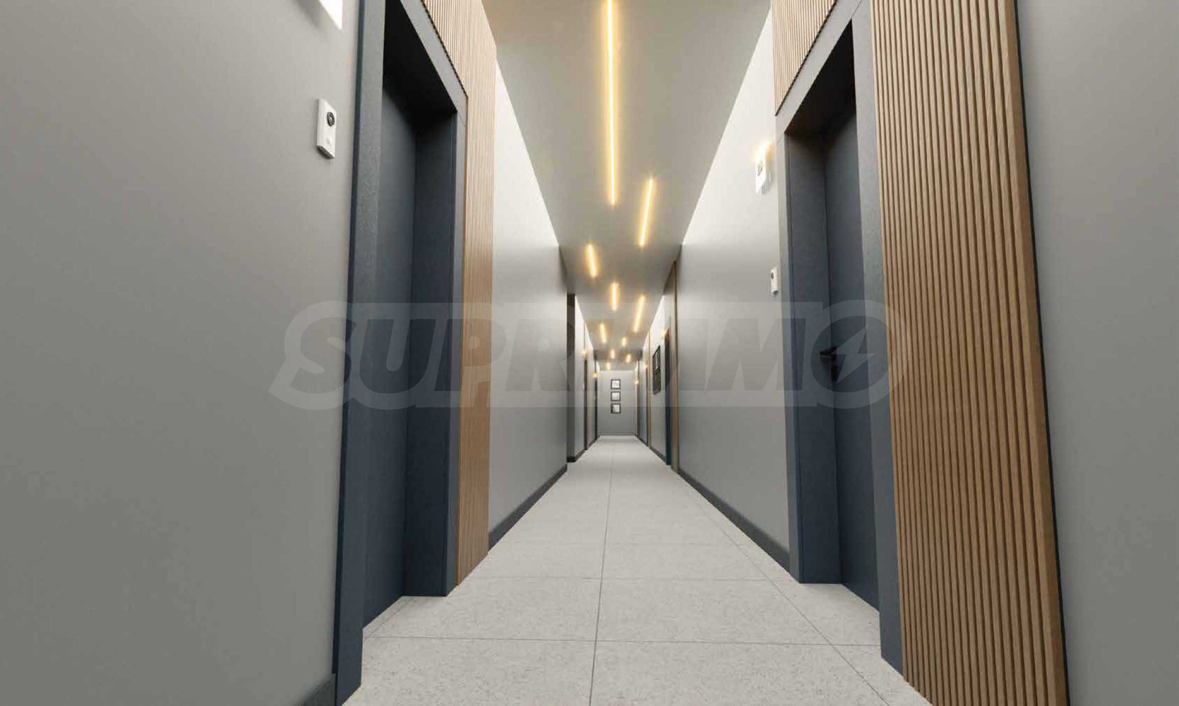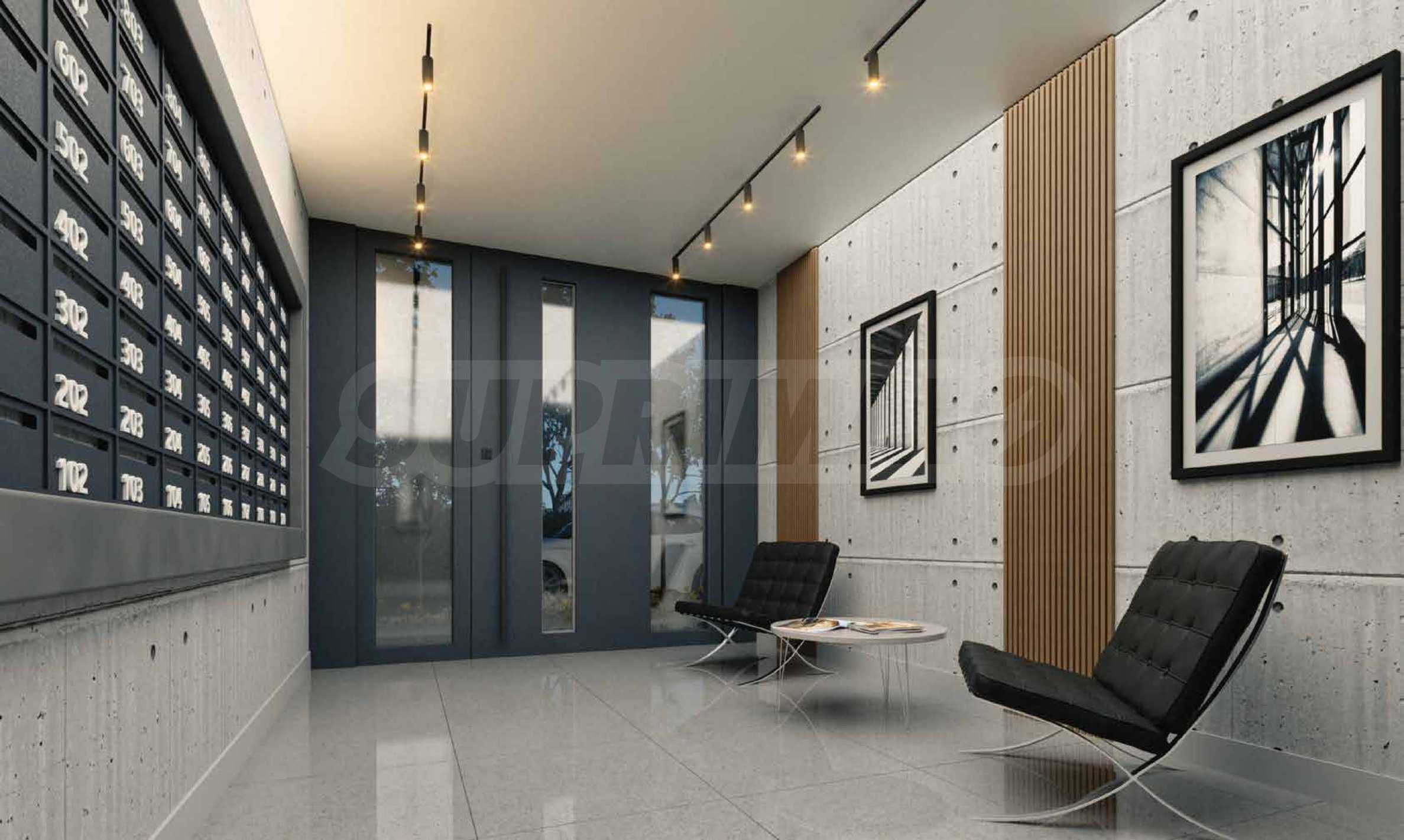 Projekt części wspólnych budynków jest luksusowy i atrakcyjny i obejmuje połączenie poddanego obróbce betonu architektonicznego, naturalnych boazerii, designerskiego oświetlenia i granitu, wind ORONA i metalowych balustrad.