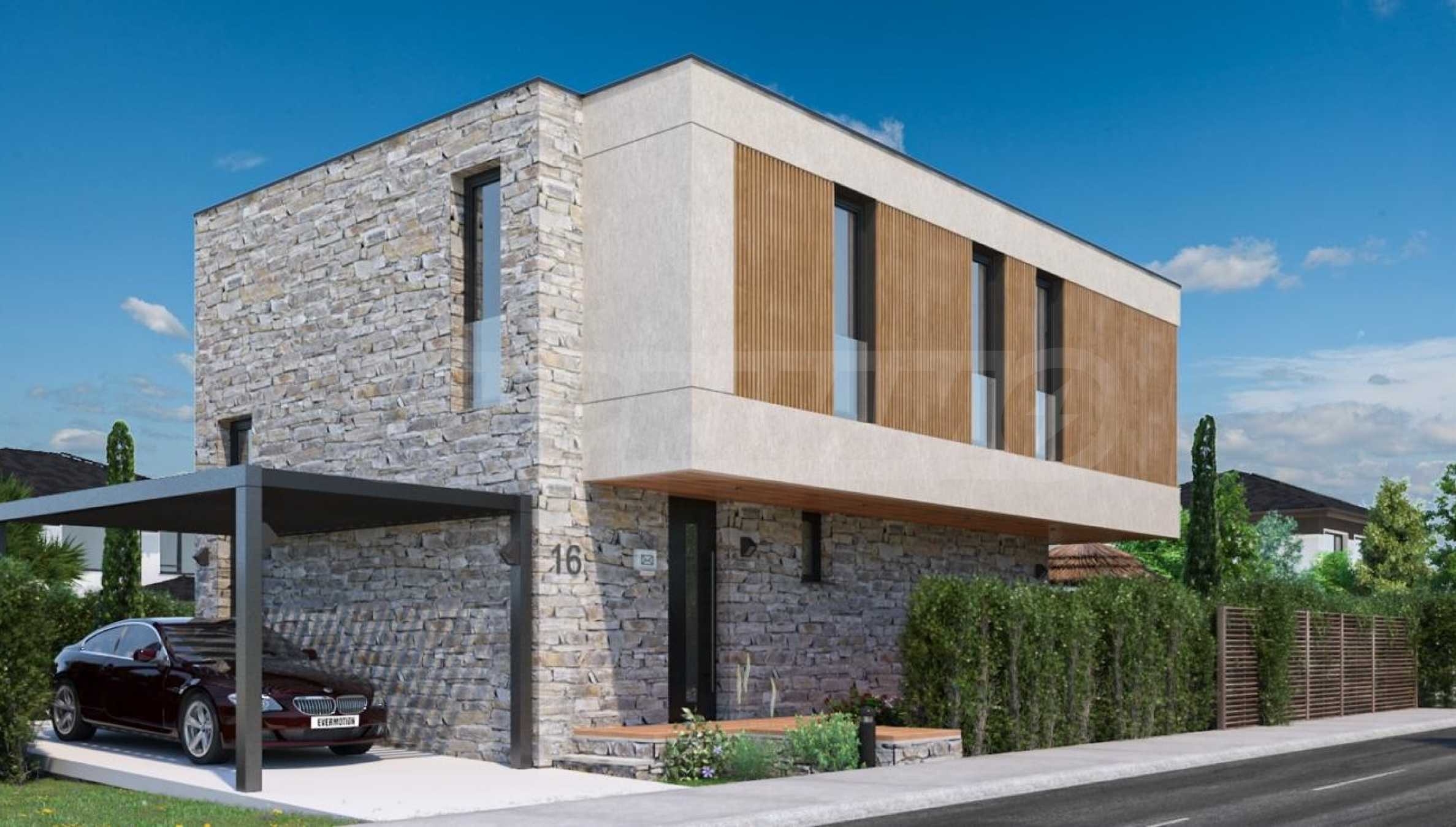• w pełni wykończona elewacja z tynkiem mineralno-silikonowym, naturalnym kamieniem elewacyjnym i listwami z drewna kompozytowego;