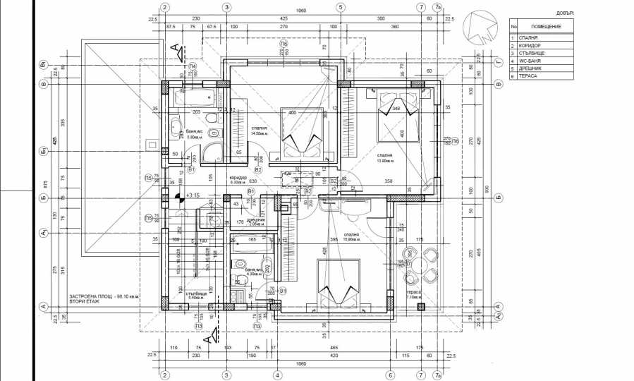 • 2 piętro: 3 sypialnie, 1 taras (z wyjściami na niego z 2 sypialni), 2 łazienki, korytarz, schody.