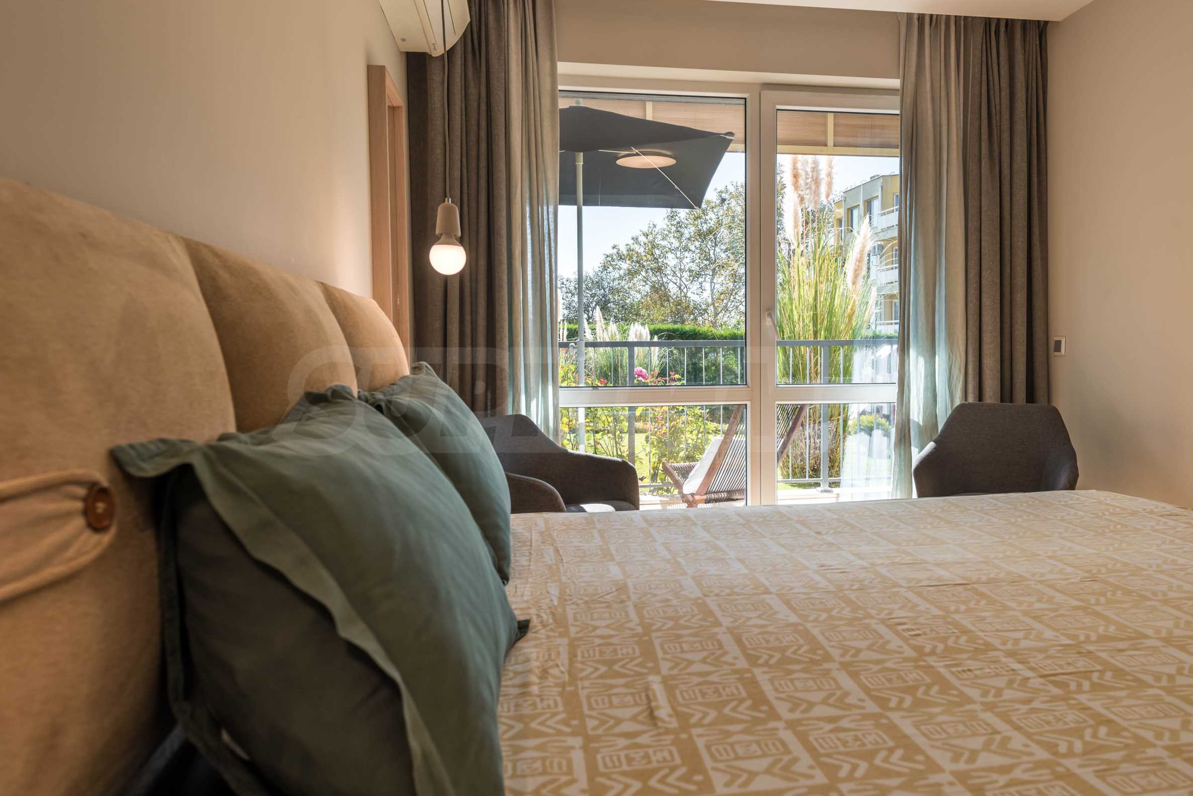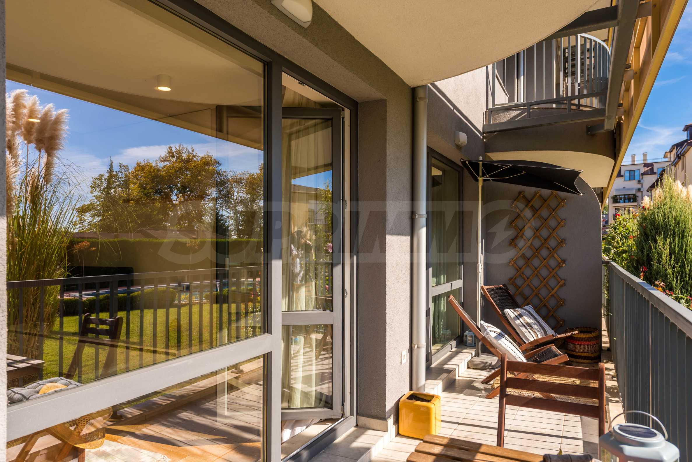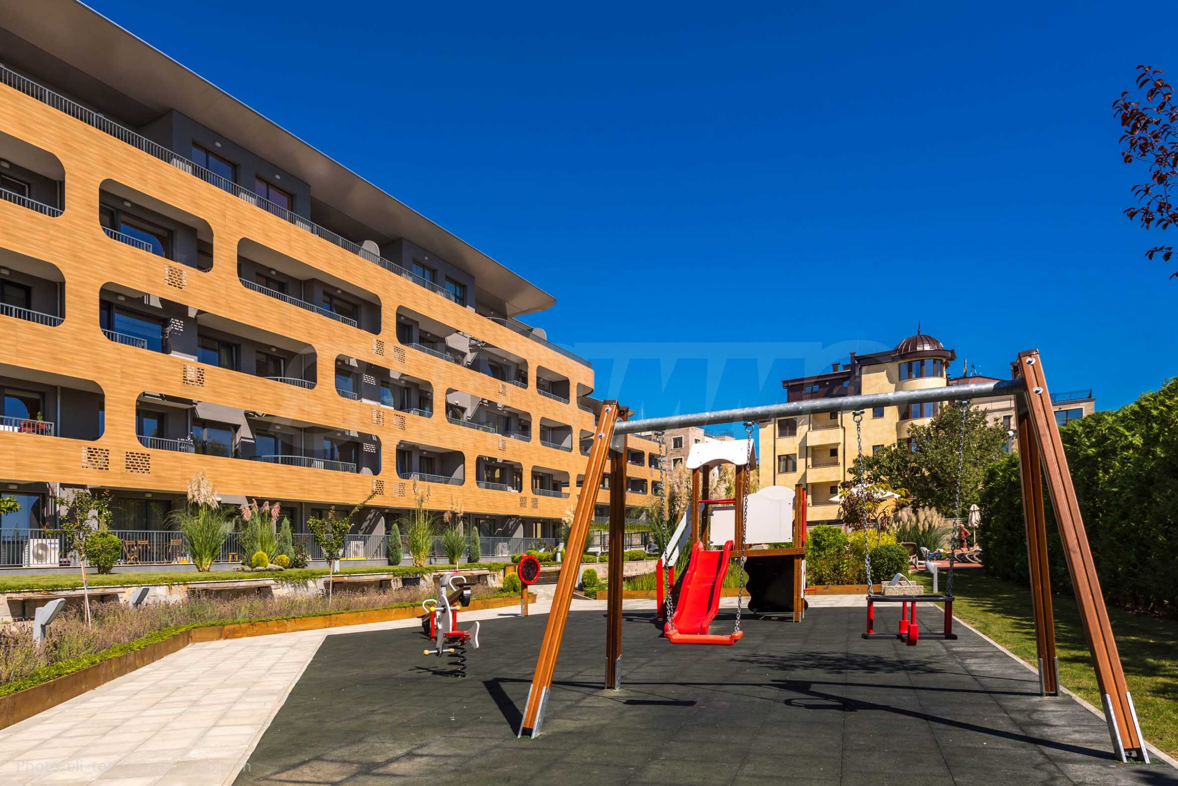 Nieruchomość o powierzchni całkowitej 71 m2 zlokalizowana jest na parterze 5-piętrowego budynku z ekspozycją południową na terenie zamkniętego kompleksu, blisko morza.