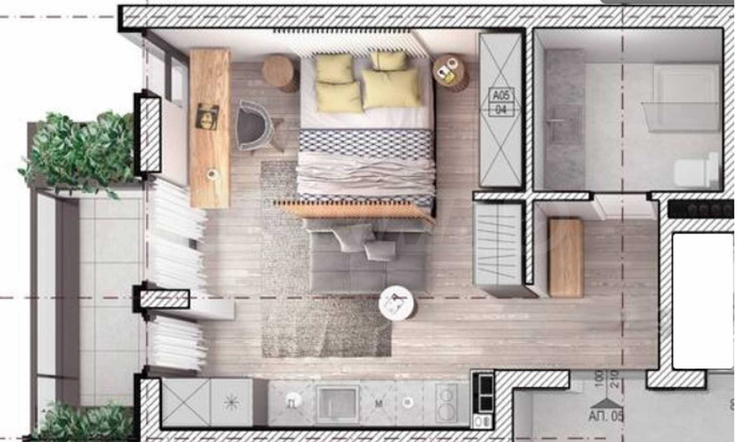 Nieruchomość ma powierzchnię całkowitą 56,21 m2, znajduje się na 2 piętrze i składa się z przedpokoju, salonu z kuchnią, łazienki z toaletą oraz tarasu. Dom wydawany jest w stopniu wykończenia zgodnym z normami bułgarskimi, z kitem i wylewką, z zamontowanymi pancernymi drzwiami wejściowymi.
