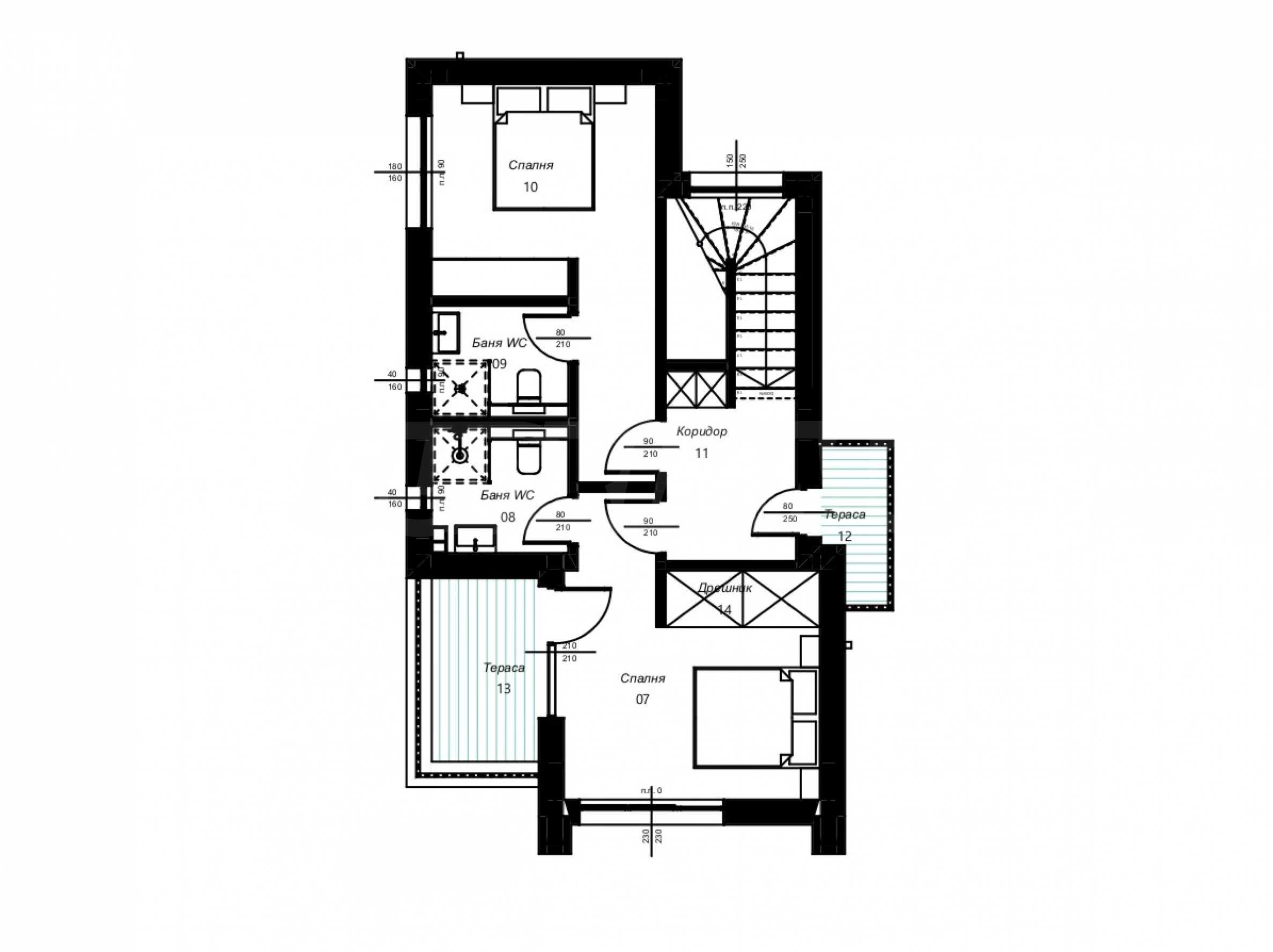 - Drugie piętro: dwie sypialnie z prywatnymi łazienkami, garderoba, dwa tarasy.