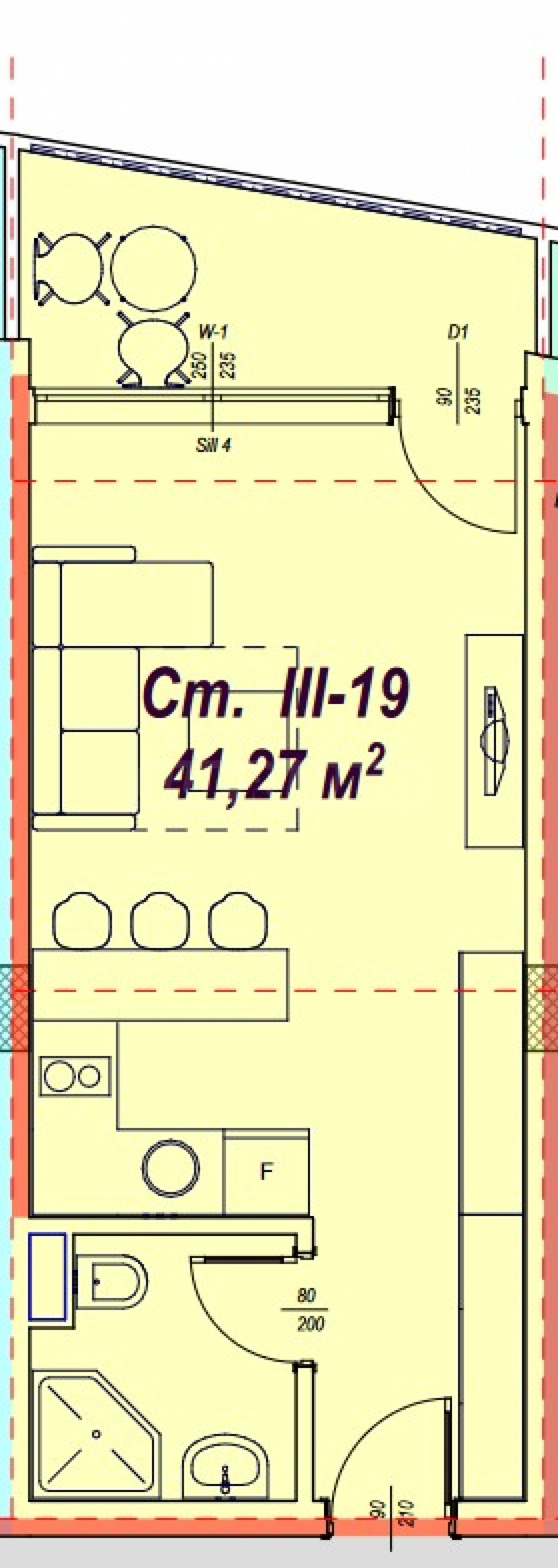 Nieruchomość o powierzchni całkowitej 41,27 mkw, położona jest na 3 piętrze z tarasem.