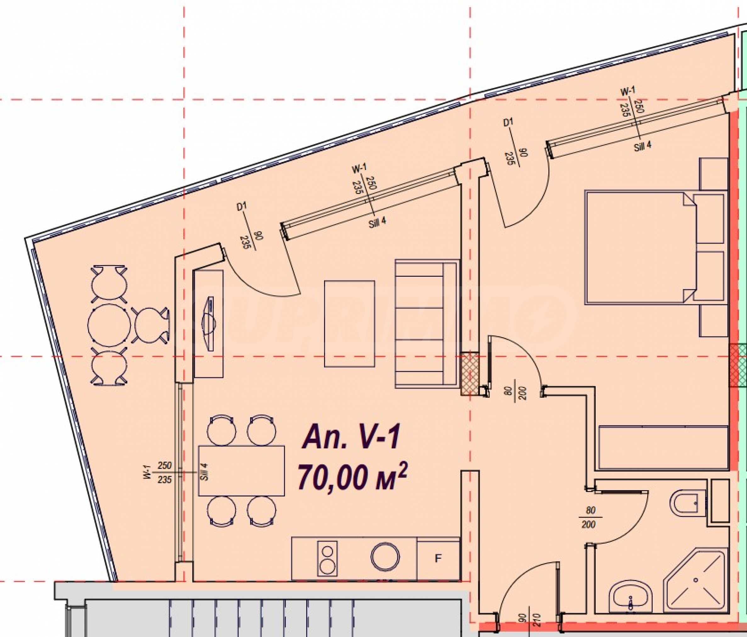 Nieruchomość o powierzchni całkowitej 70 m2, położona na 5 piętrze, składa się z przedpokoju, salonu z kuchnią, sypialni, łazienki z toaletą oraz tarasu widokowego.