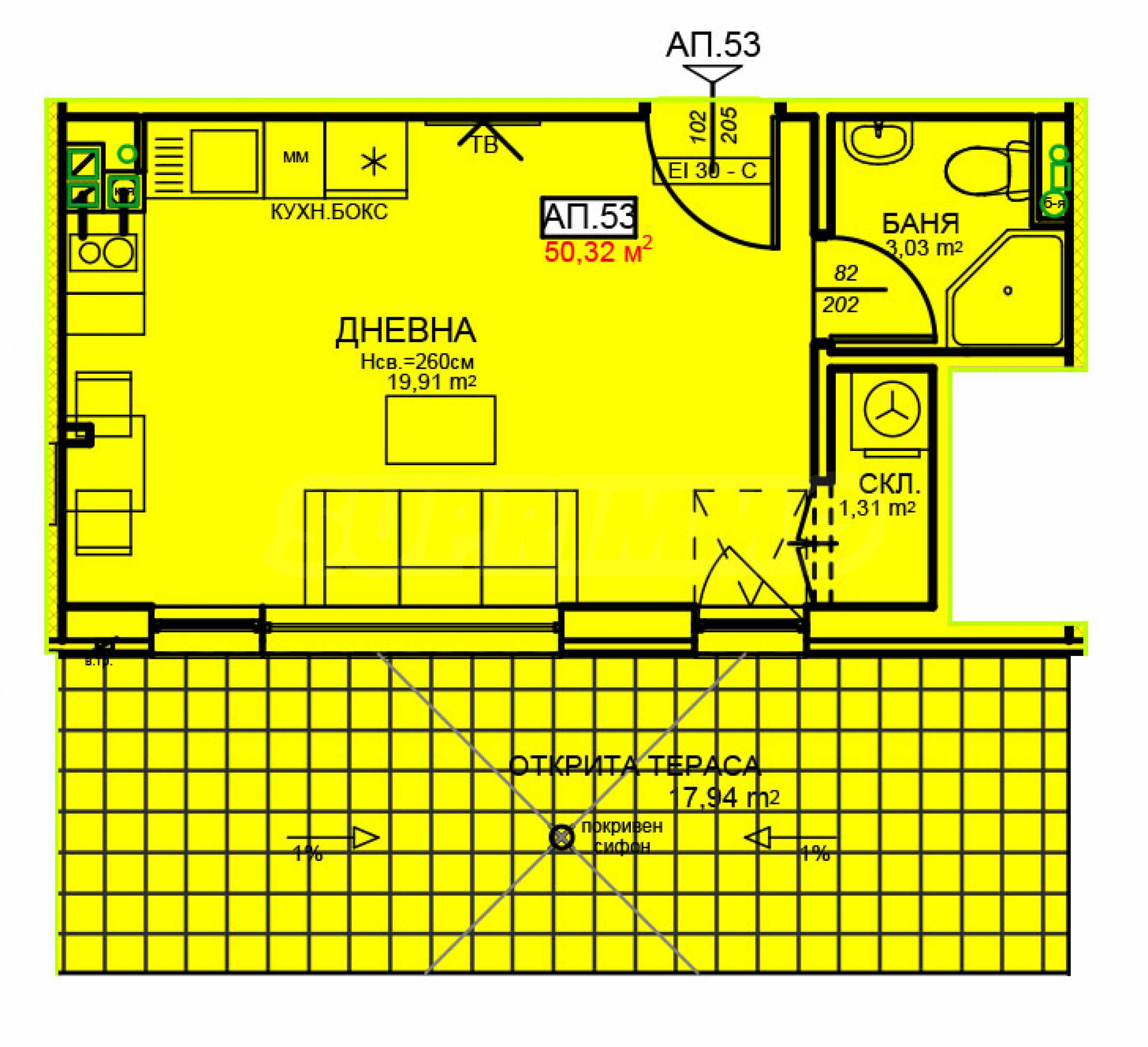 - pokój dzienny z aneksem kuchennym: 19,91 m2;