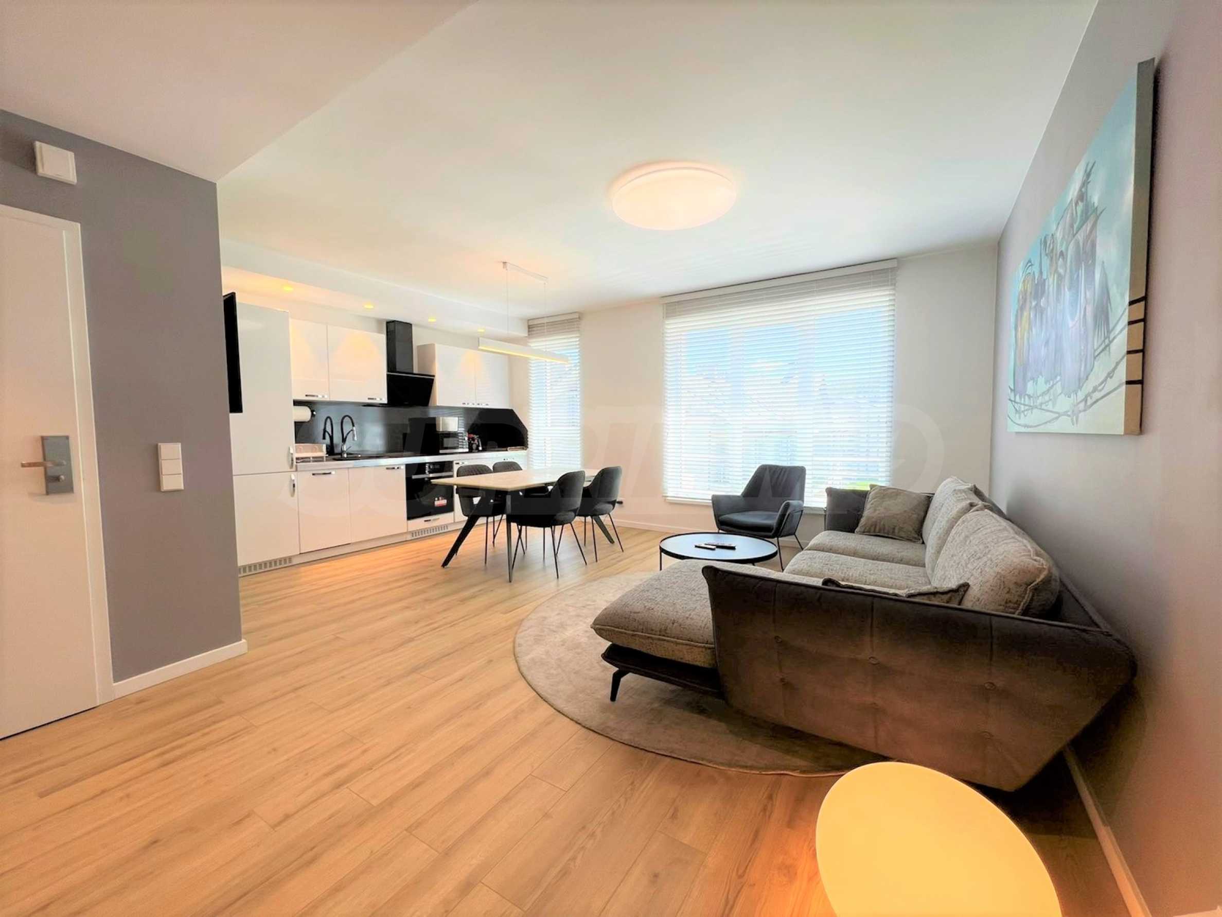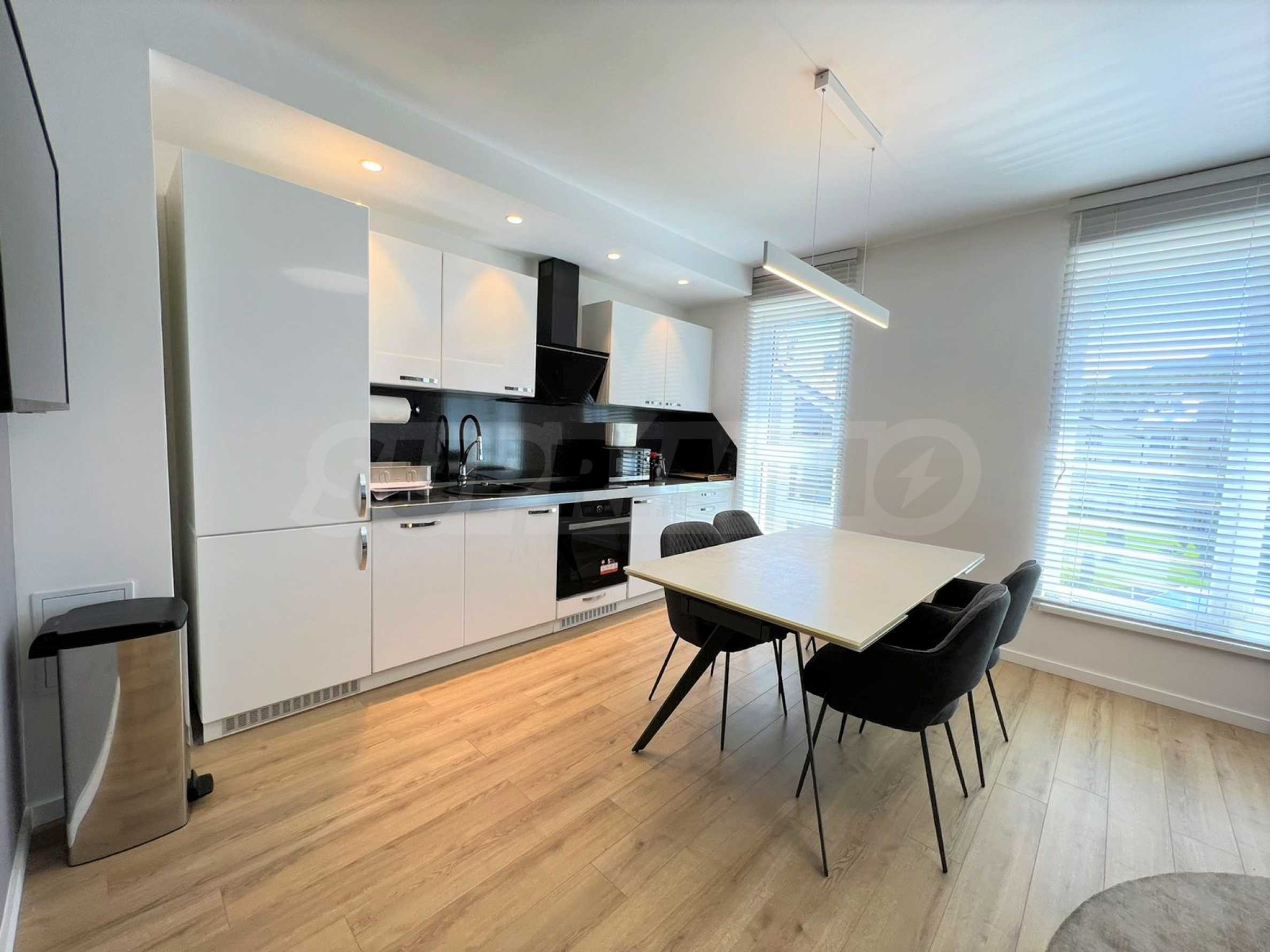 Mieszkanie zostało zaprojektowane indywidualnie, z dużą dbałością o szczegóły. Do dekoracji wykorzystywane są wyłącznie najwyższej jakości i naturalne materiały. Przestronny salon wyposażony jest w miękkie meble oraz białą kuchnię, która jest w pełni wyposażona w wysokiej klasy sprzęt AGD w kolorze białym i czarnym: pralkę, zmywarkę, piekarnik, płytę grzejną oraz wysokiej klasy lodówkę.