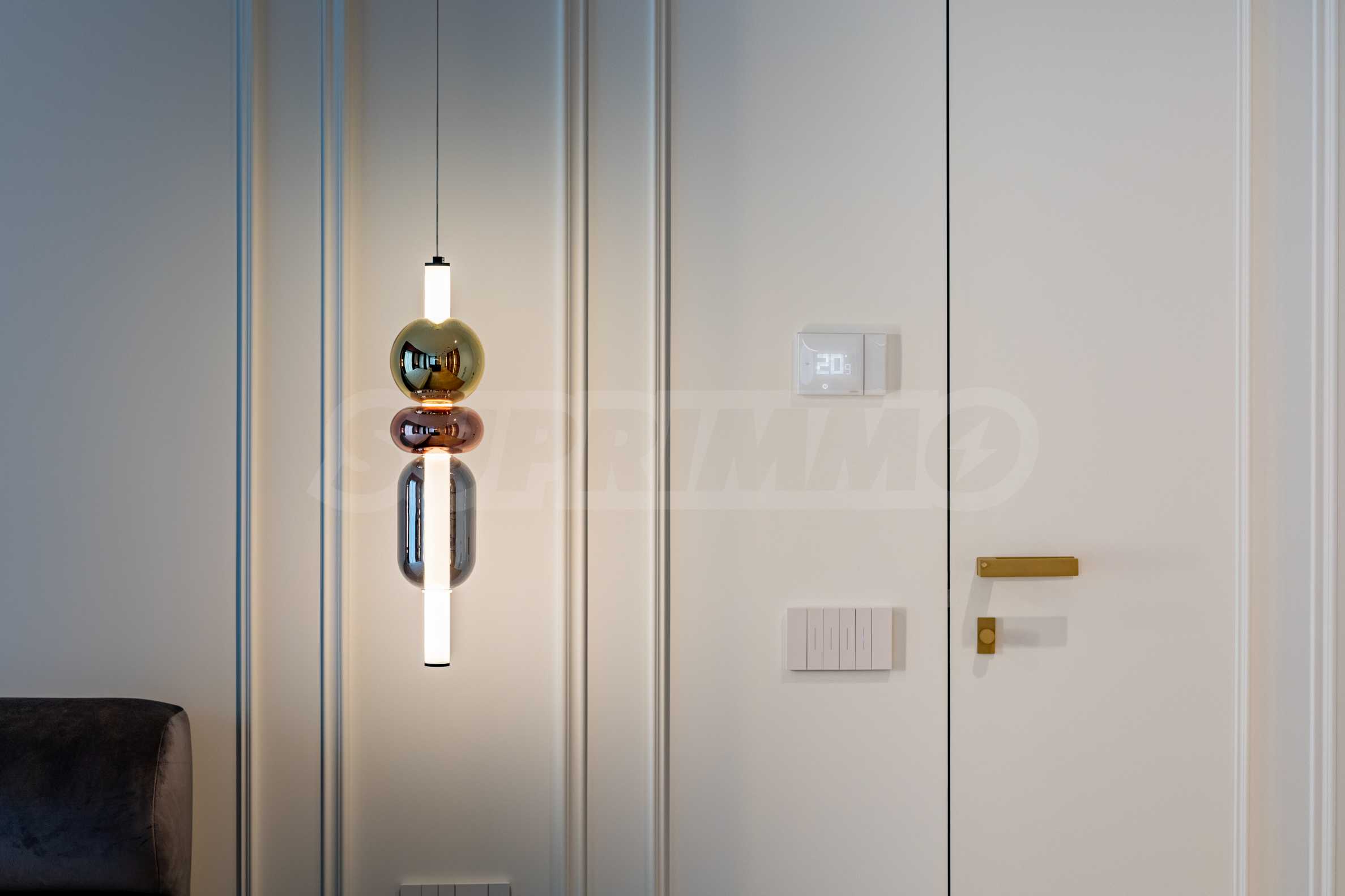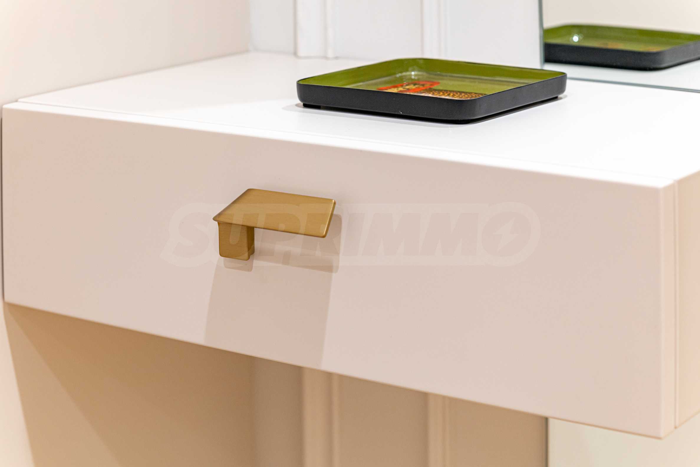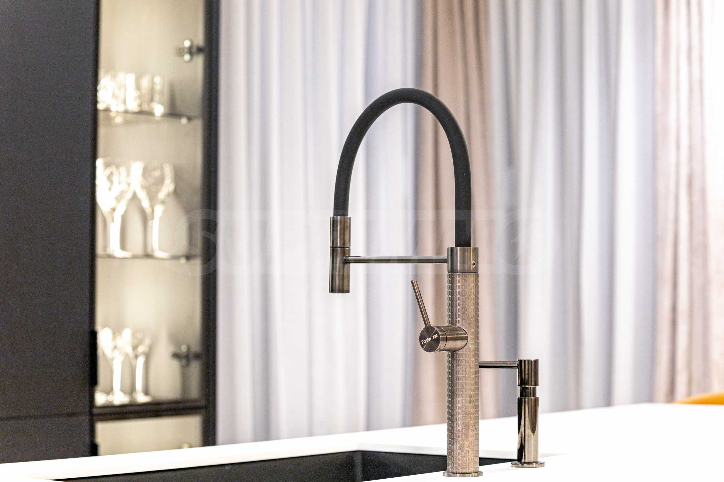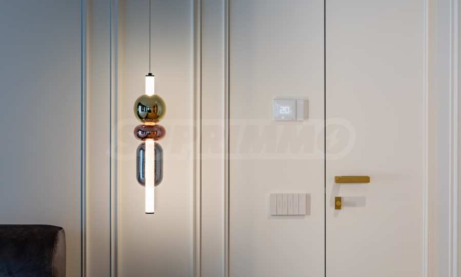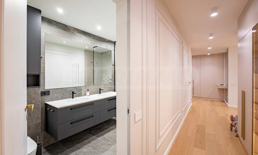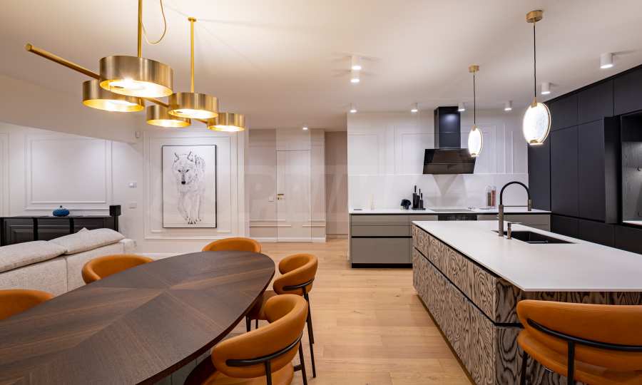 Mieszkanie wyróżnia się stylowym wnętrzem z wysokiej jakości włoskimi materiałami wykończeniowymi: