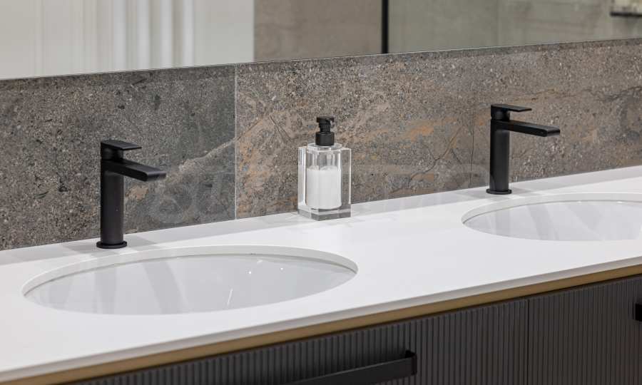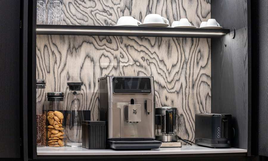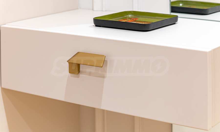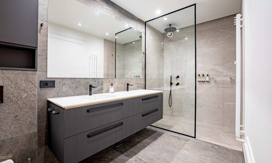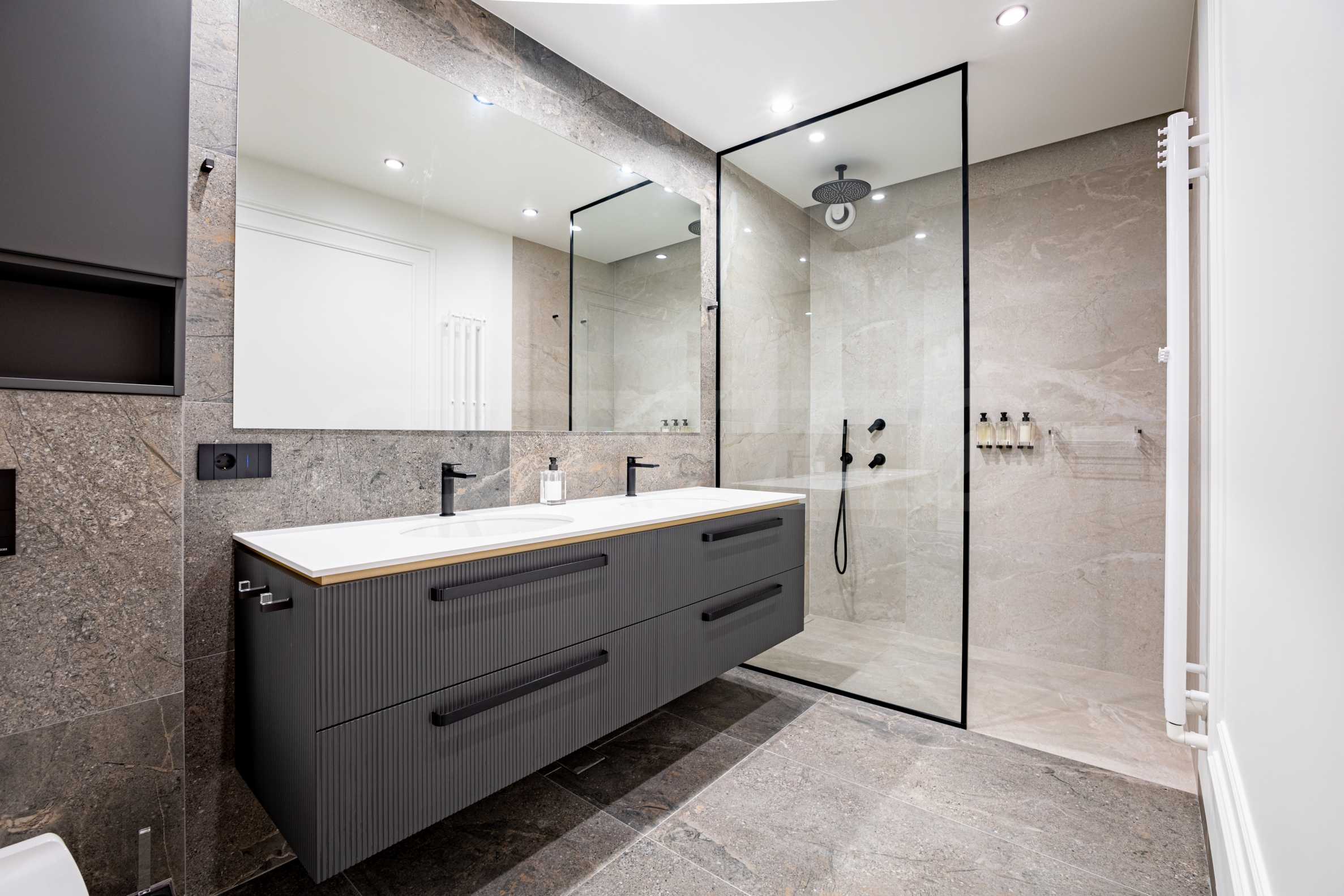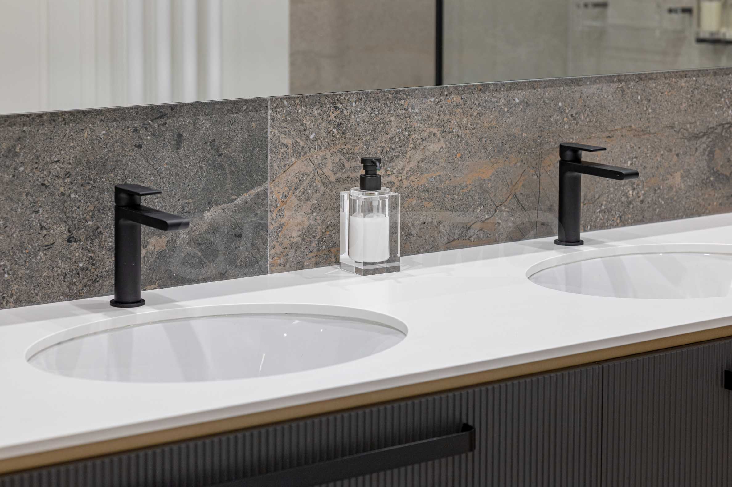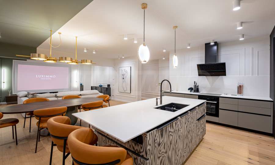 Mieszkanie wyróżnia się stylowym wnętrzem z wysokiej jakości włoskimi materiałami wykończeniowymi: