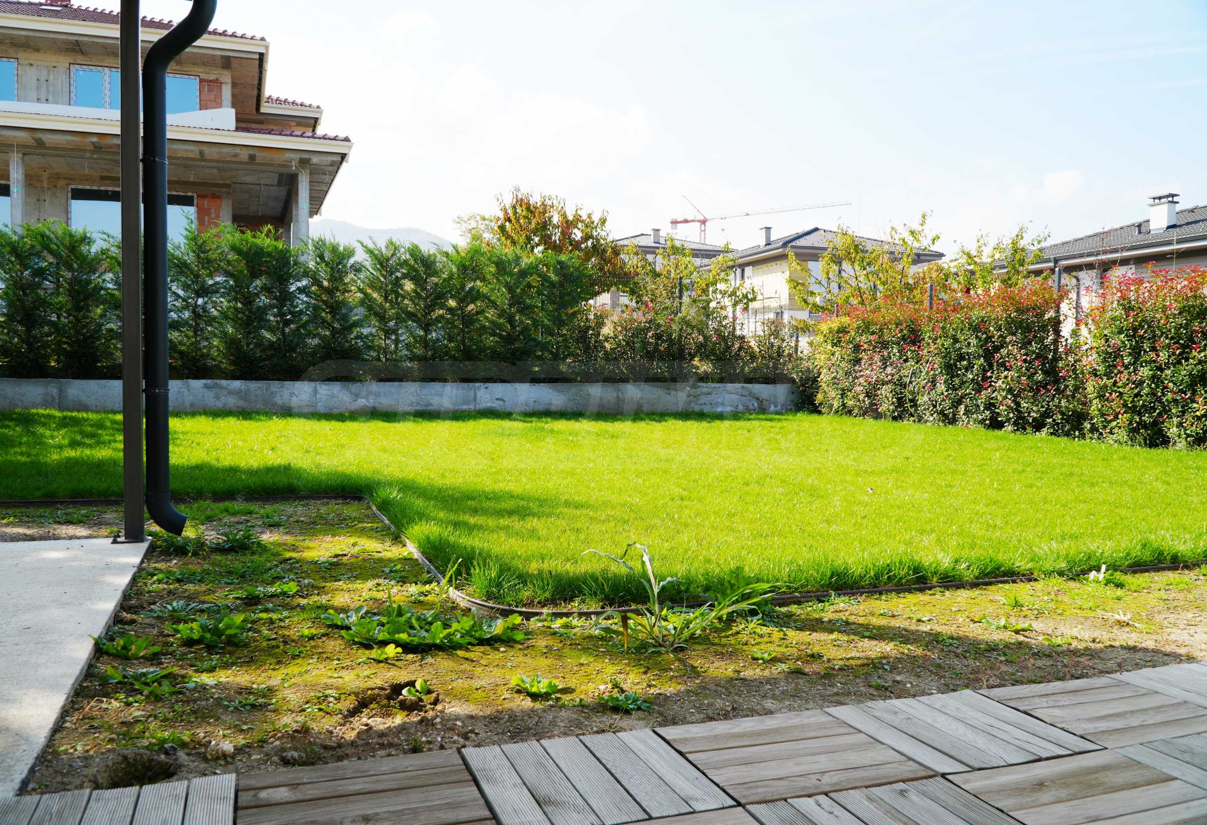 Ogród jest w pełni zagospodarowany i wyposażony w automatyczny system nawadniania Rain Bird, system nawadniania kropelkowego oraz studnię z pompą hydroforową.