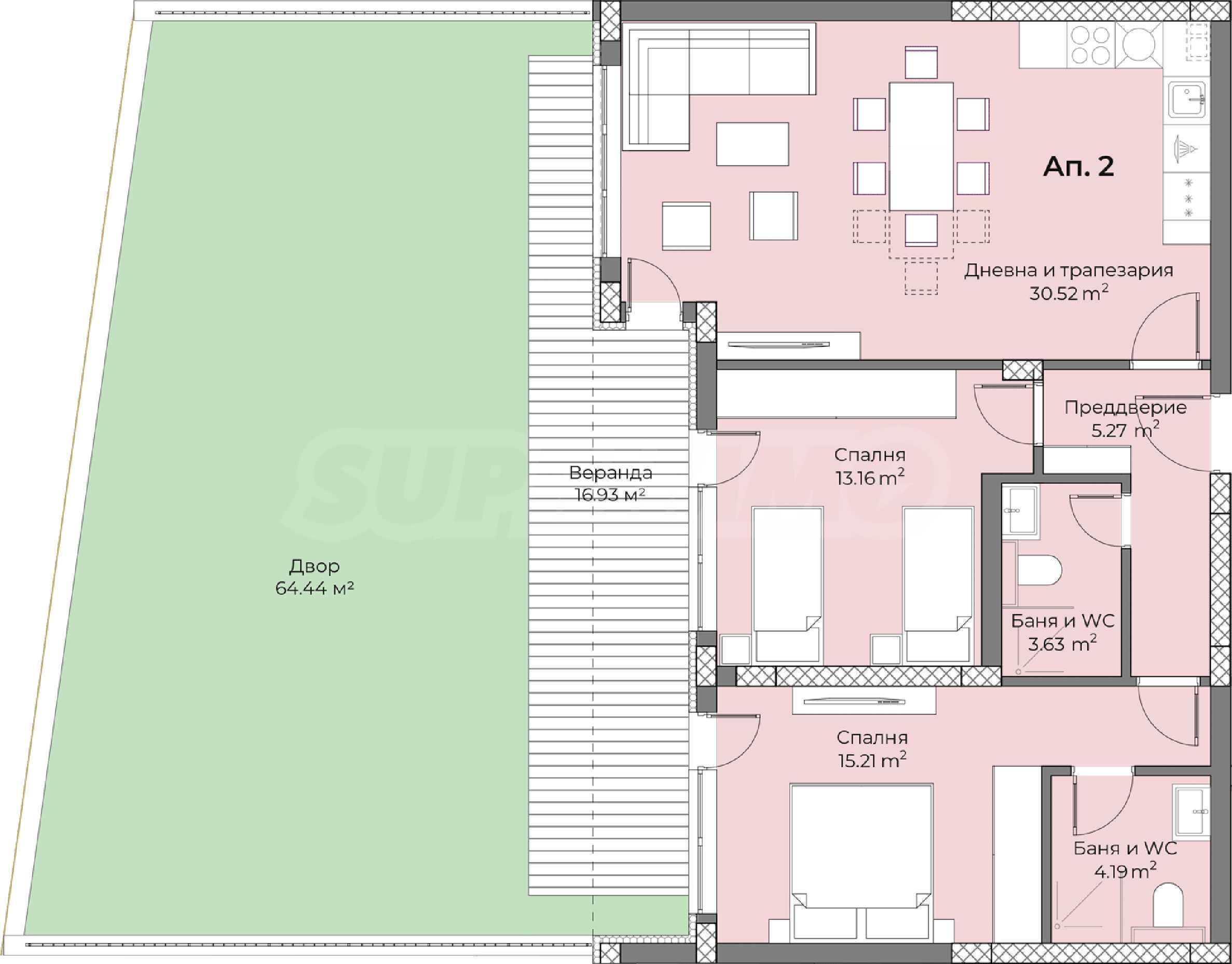 Prezentujemy mieszkanie trzypokojowe w nowym kompleksie mieszkaniowym, w południowej części dzielnicy Płowdiw. „Białomorski”.