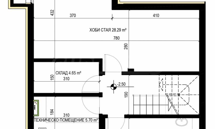 - W piwnicy (na wysokości -2,40 z naturalnym oświetleniem „angielskiego dziedzińca”) znajdują się pomieszczenia usługowe takie jak magazynek, pomieszczenie mokre oraz pokój hobbystyczny.